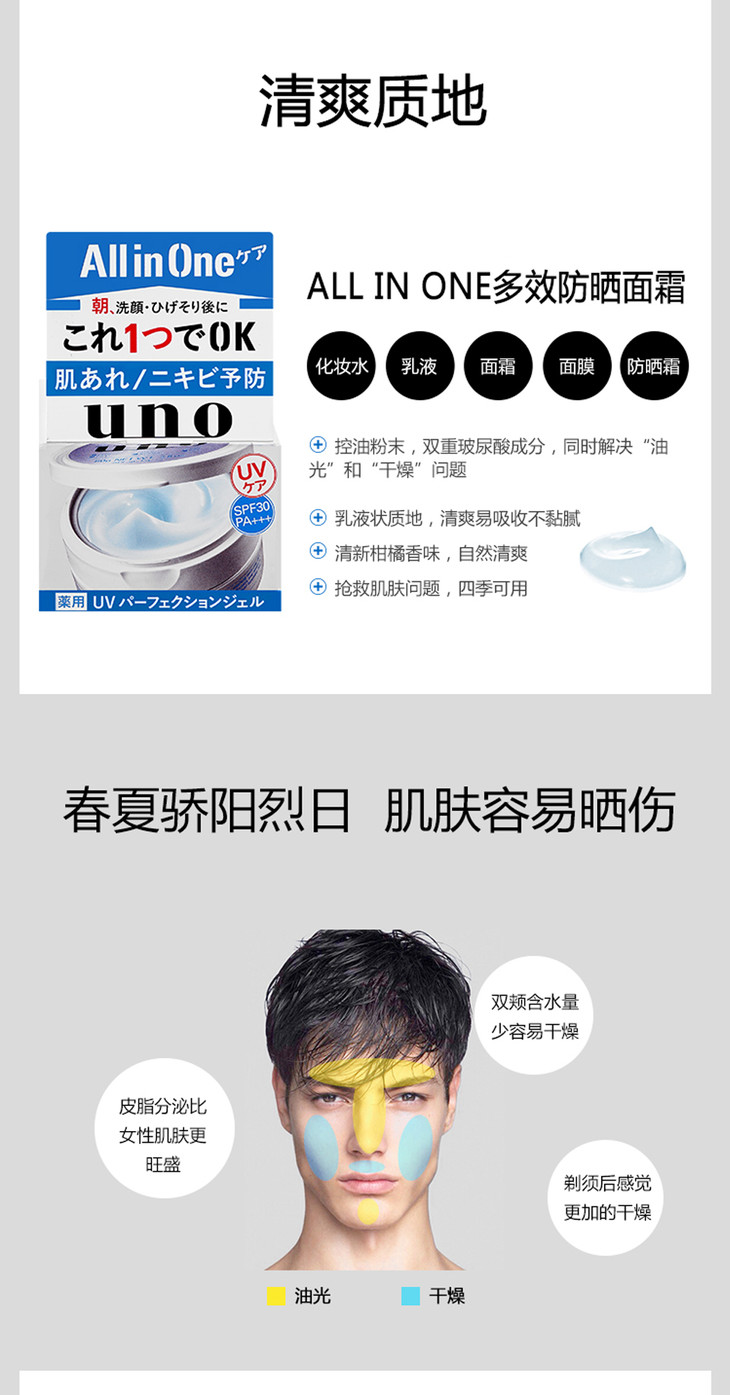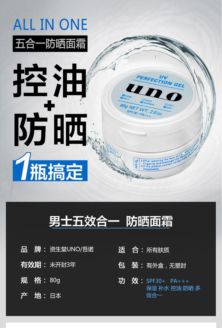 资生堂UNO男士防晒面霜/控油清爽防晒80g-会员6折