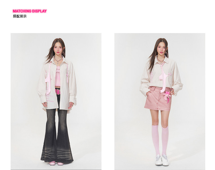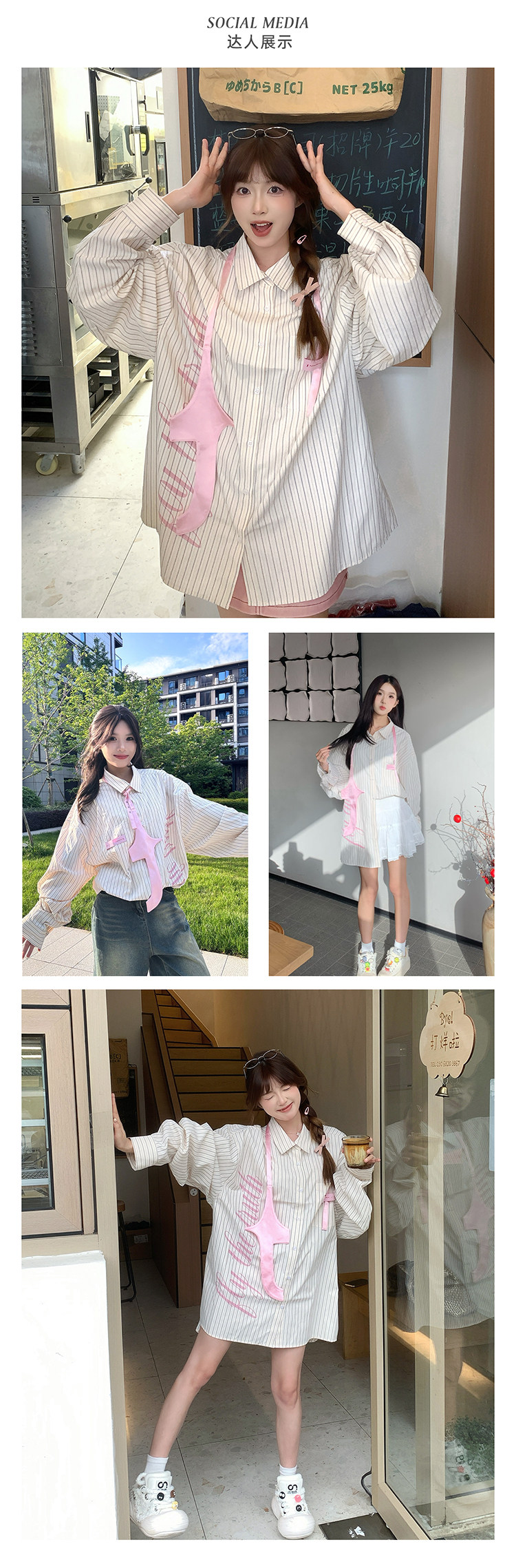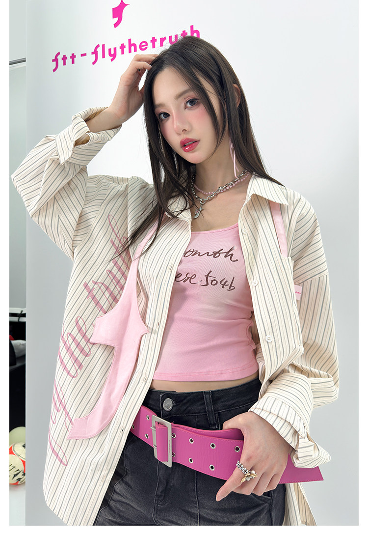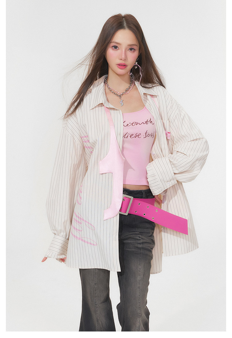 FTT Flythetruth 初桃韵律 涂鸦印花条纹衬衫女秋季宽松休闲衬衣
