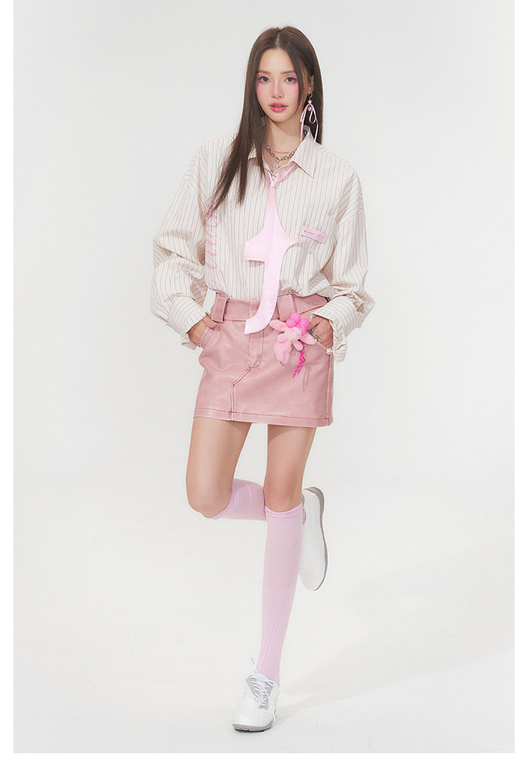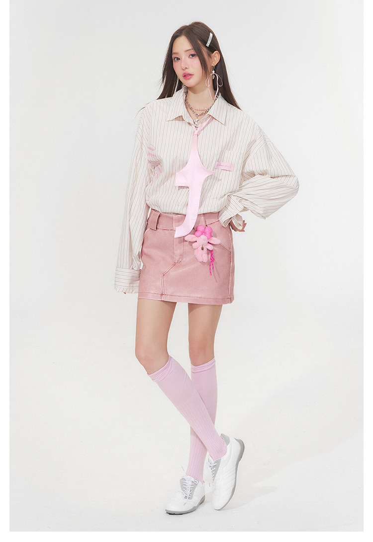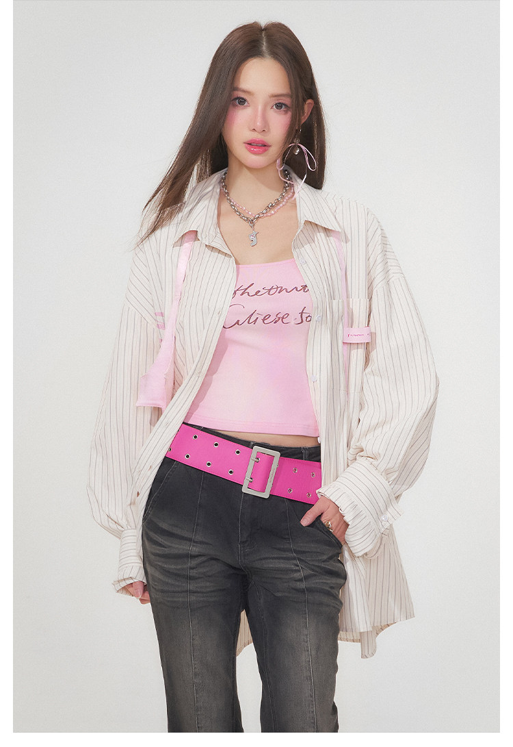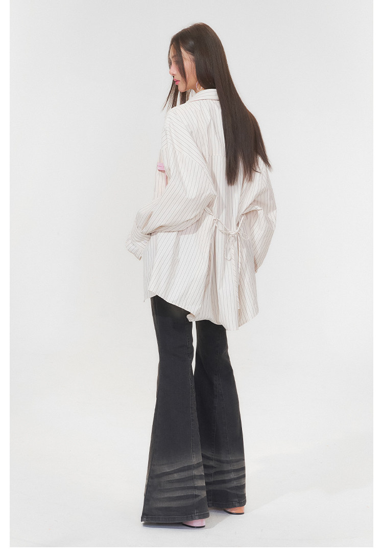 FTT Flythetruth 初桃韵律 涂鸦印花条纹衬衫女秋季宽松休闲衬衣
