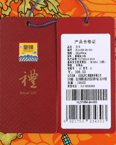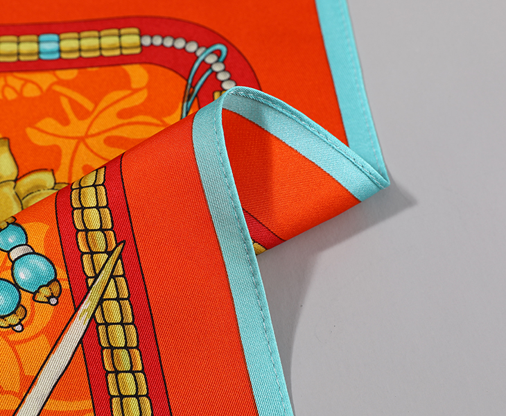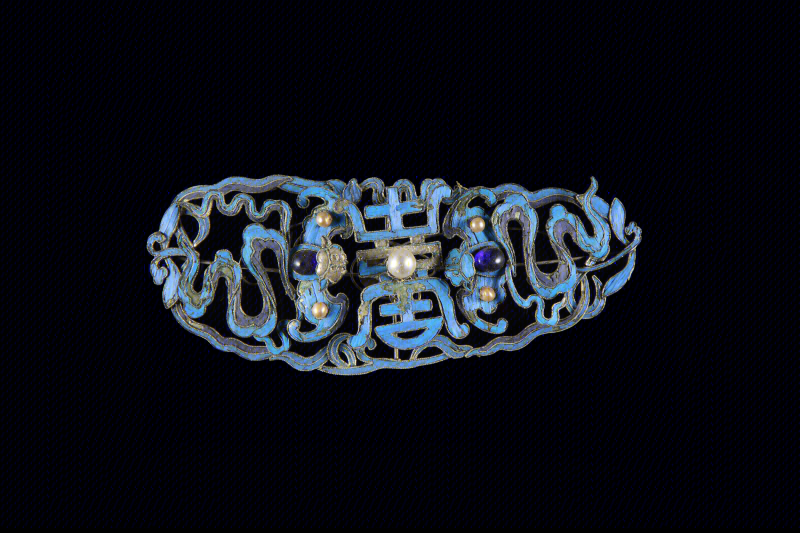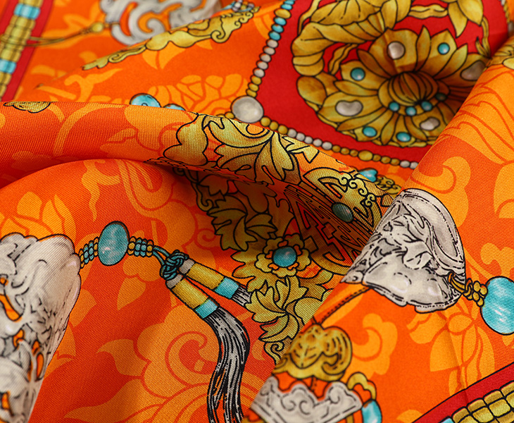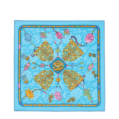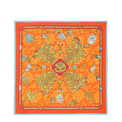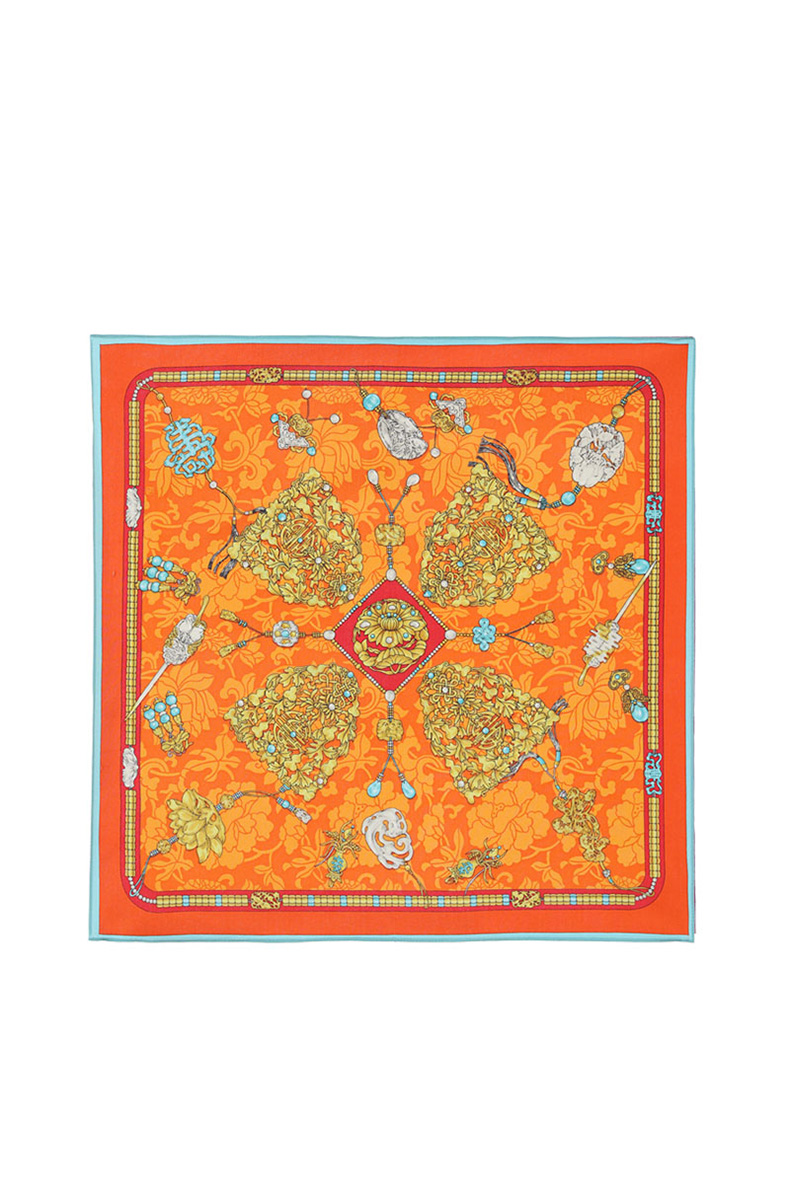中国古代饰品多以金、银、铜、珠、玉、翠、水晶、玛瑙、料石、珊瑚以及各种香木等贵重材料制作。此款丝巾的设计元素取自故宫博物院院藏清代后妃冠服上的金玉珠宝,内含翡翠牌饰、八宝钗、双凤簪等珠宝首饰。图案寓意吉祥、福寿安康、百财俱来。熠熠生辉的珠宝,折射出富贵的皇家气息,雍容华贵。丝巾上纹饰和图案具有强烈的装饰感,色彩时尚、典雅。