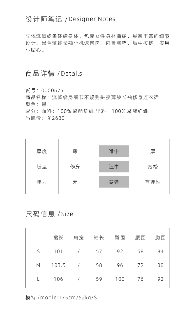 【浮世日】流畅绕身细节不规则拼接薄纱长袖黑色修身连衣裙/0000675
