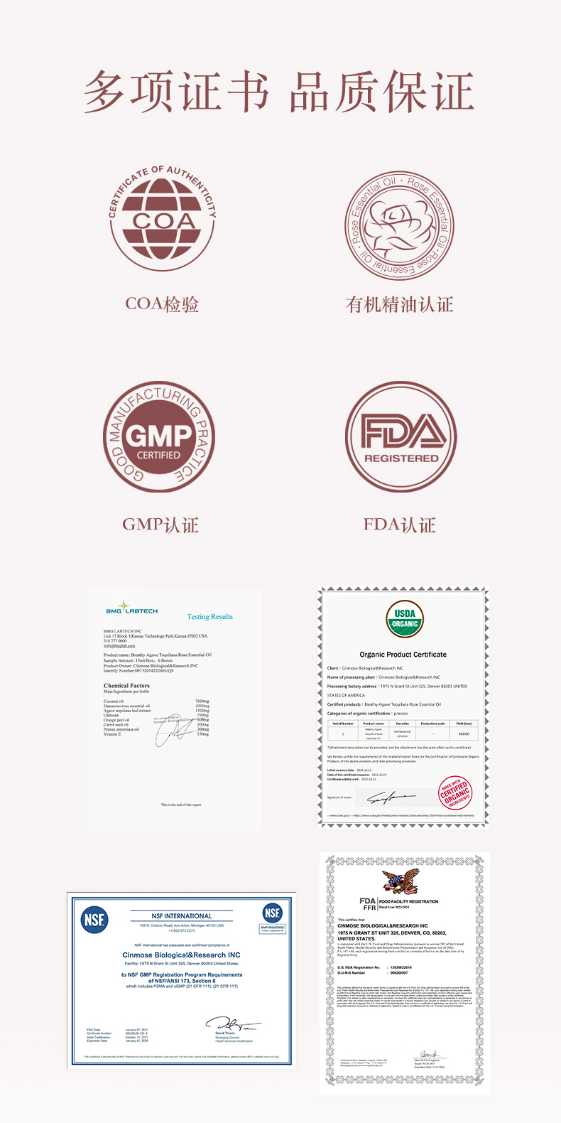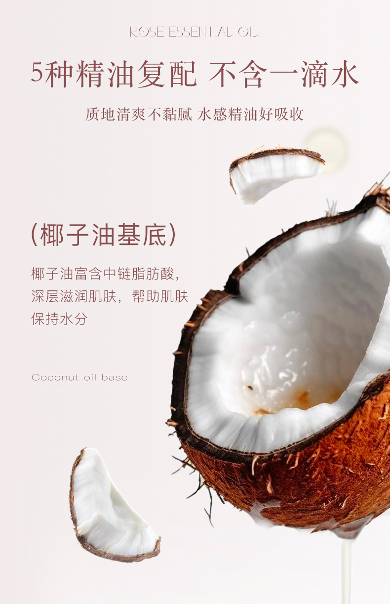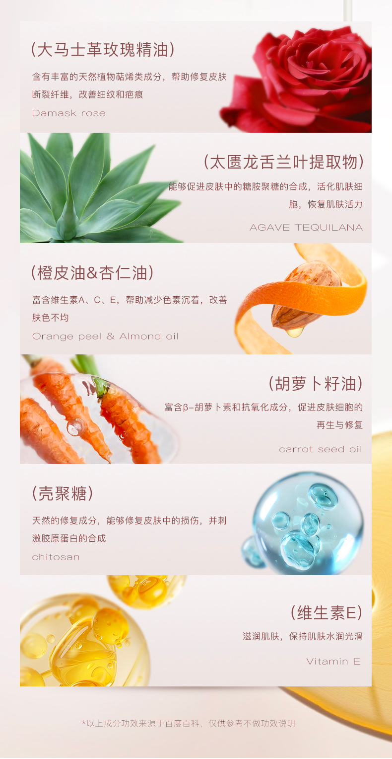 【主要成分】椰子油、大马士革玫瑰精油、太匮龙舌兰(AGAVE TEQUILANA)叶提取物、壳聚糖、橙皮油、胡萝卜籽油、杏仁油、维生素E