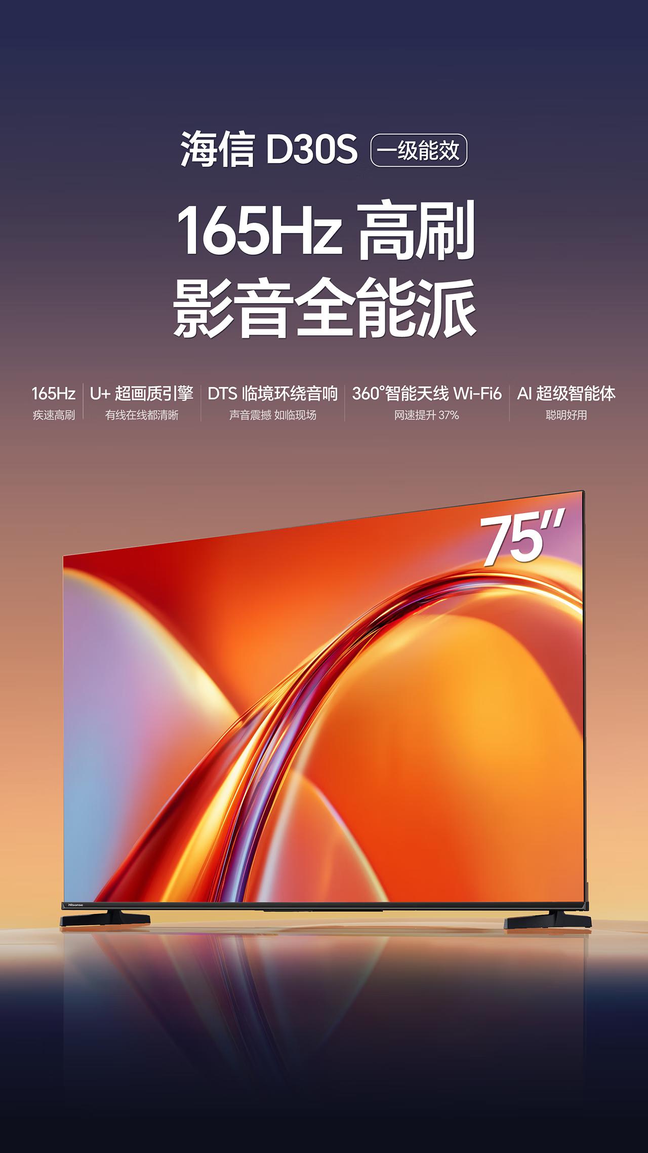 海信电视75D30S 75英寸 165Hz高刷 U+超画质引擎 DTS临境环绕音响 360°智能天线Wi-Fi6 D30S