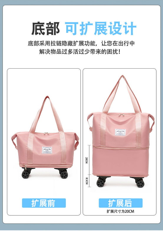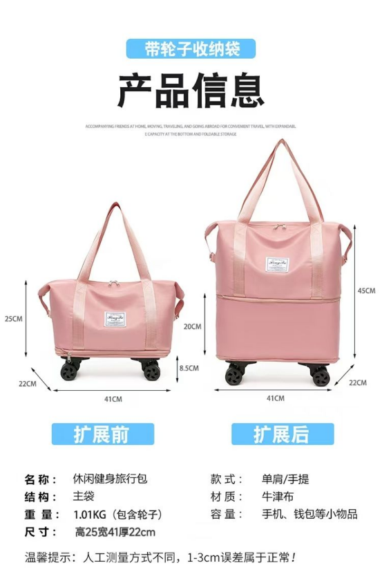 它还有一个时尚的设计——滑轮 让你一眼就能认出它来 最重要的是,它的容量非常大 可以装下你的所有衣物,性价比也很高哦! 相信我,有了它,你的旅行一定会更加方便和愉快