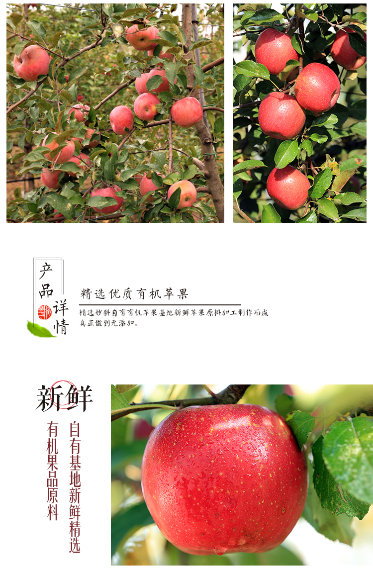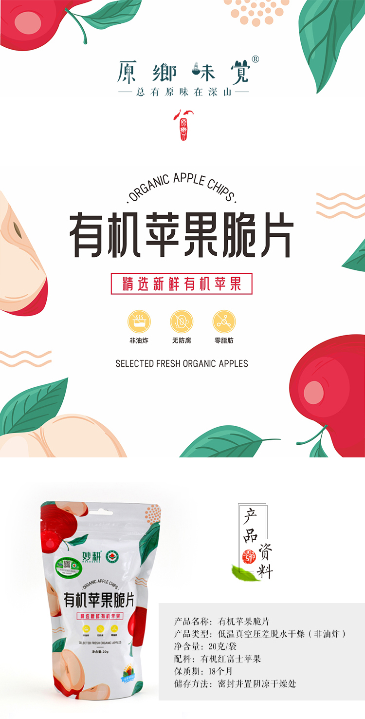 【分类】:水果干制品 【规格】:20g*3袋、20g*6袋、20g*12袋 【配料】:有机红富士苹果 【产品执行标准】:NYT2779 【食品生产许可证编号】:SC10262102500071 【生产日期】:见包装袋喷码 【保质期】:18个月 【贮存条件】:置于阴凉干燥处,密封保存,开封后请尽快食用 【食用方法】:开袋即食 【生产地址】:甘肃庆阳正宁县城工业集中区1号