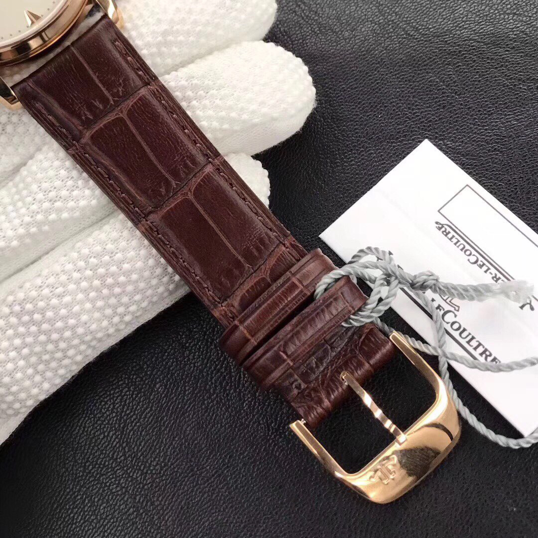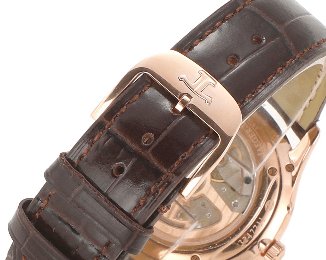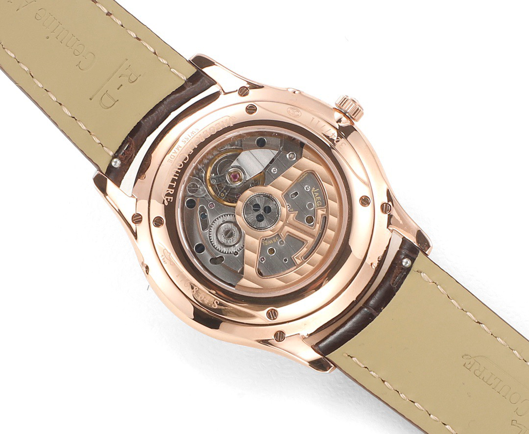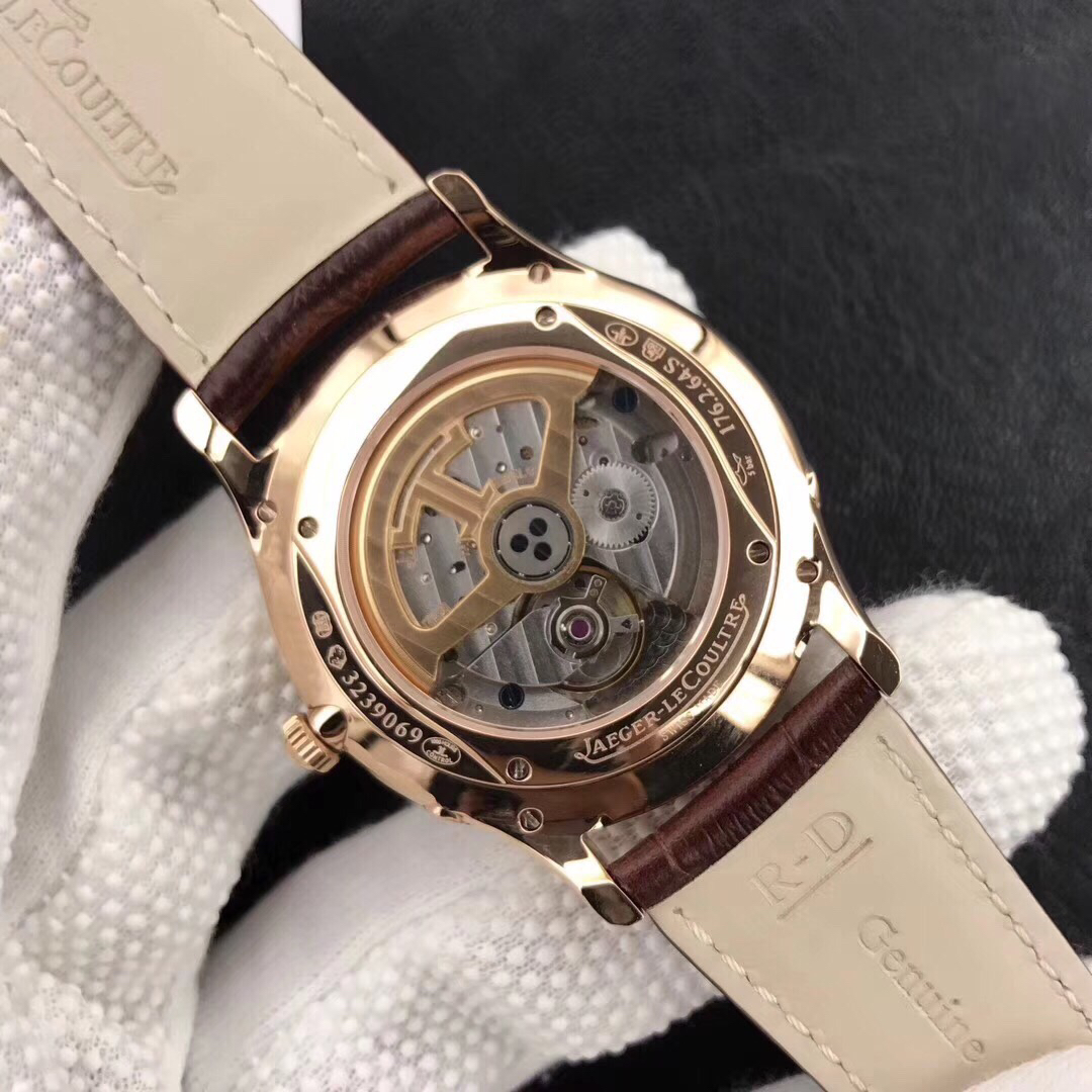 底盖采用背透设计,机芯采用9015改925/1自动上链机芯,这款机芯经过了积家独创的"1000小时检测"测试确保机芯的卓越性能和精准走时。机芯拥有253个部件,厚度仅有4.9毫米,动力储备约为38小时。