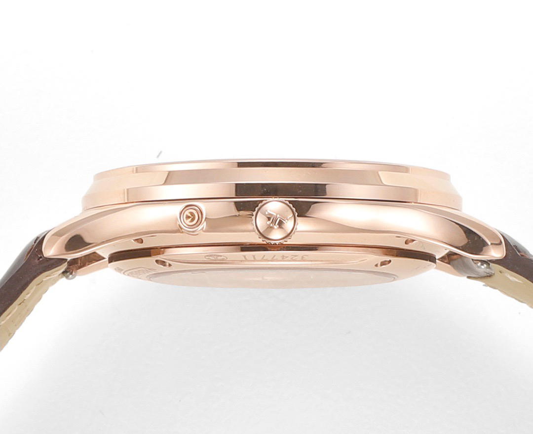 腕表直径39毫米,作为商务表这个尺寸非常适合,不显突兀。表壳采用电镀玫瑰金材质,色泽非常美观,纤薄的表圈勾勒出表款儒雅大方的轮廓,一枚蓝宝石水晶玻璃材质的表镜透光清晰,将顶级腕表的完美工艺笔无保留的展露于眼前。