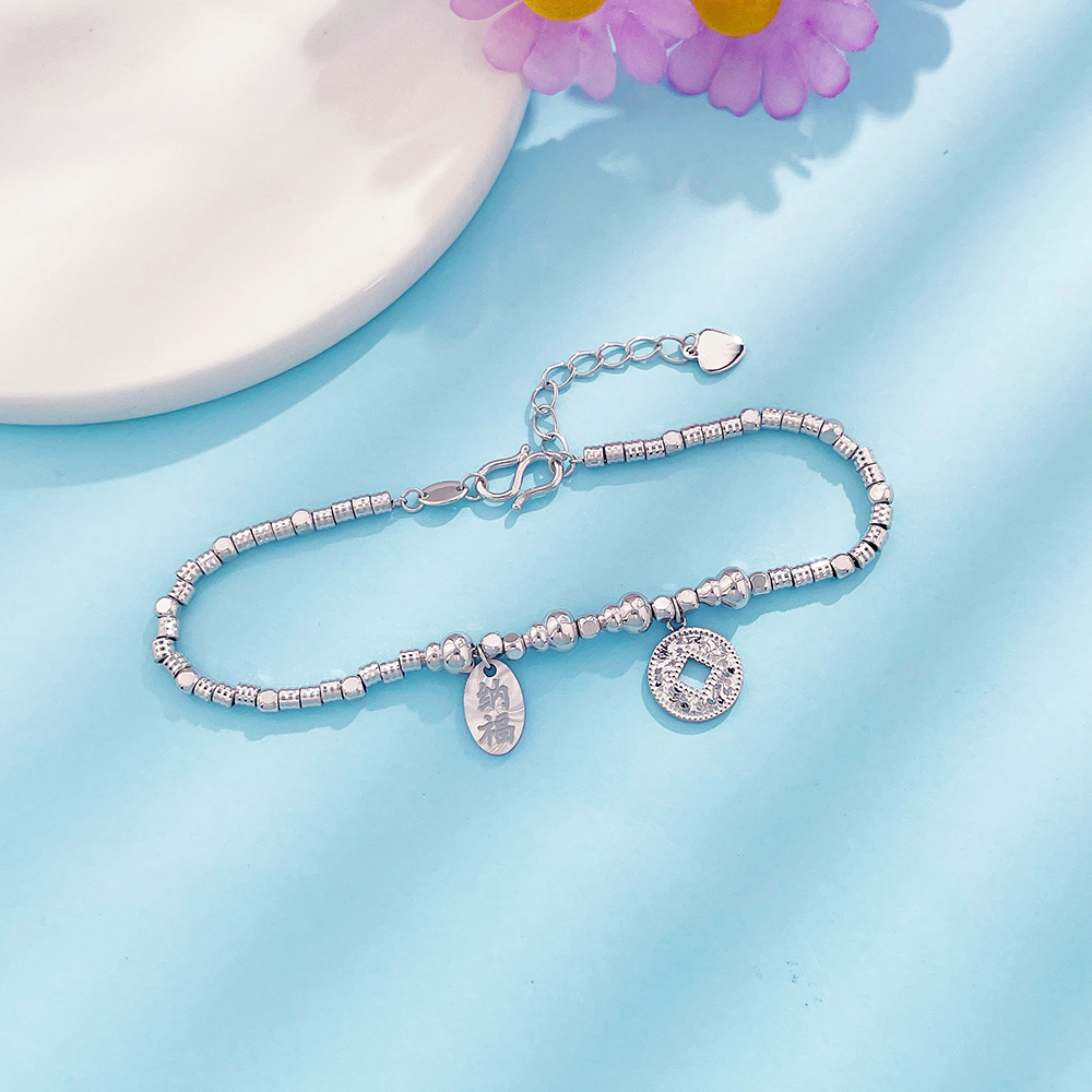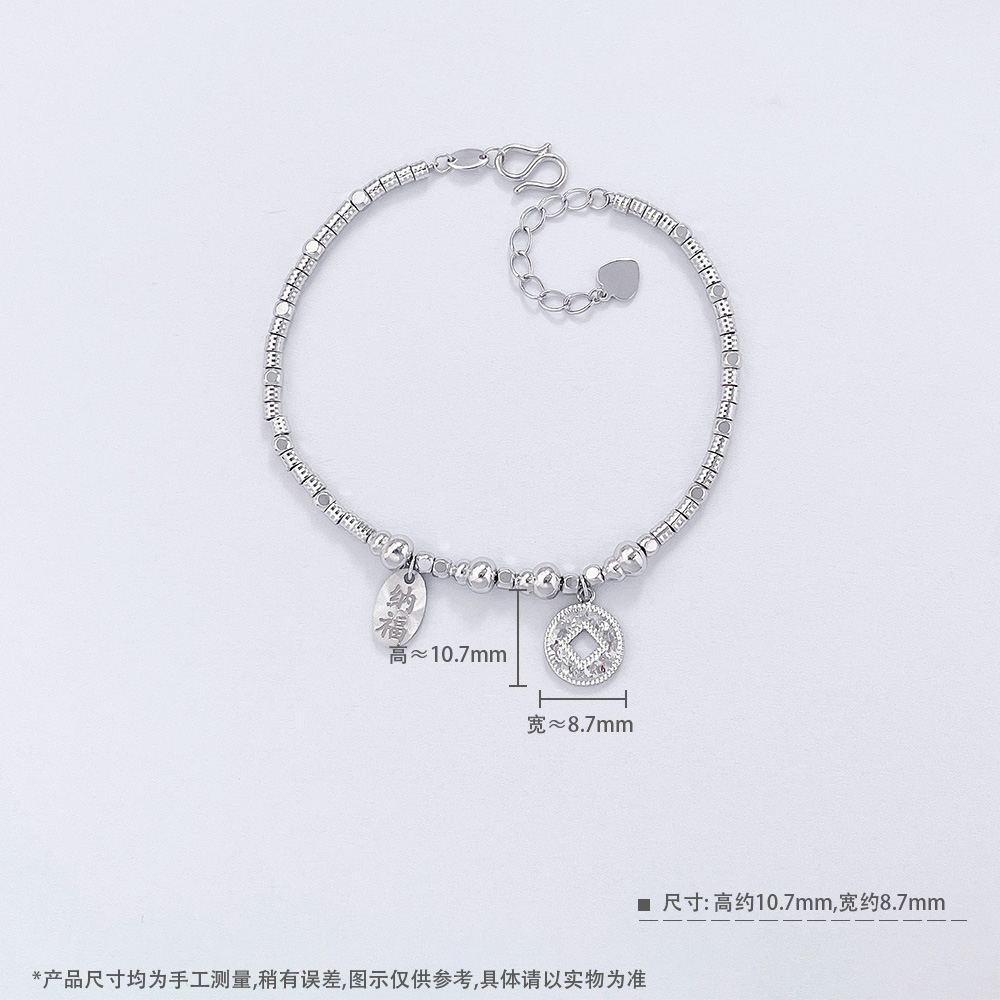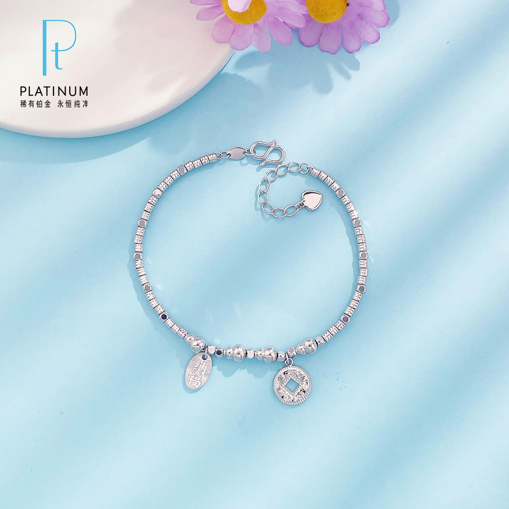 【线上铂金馆】PT950 #碎碎冰 #招财纳福 【国际铂金协会】铂金镂空招财纳福铜钱造型金币吊饰圆珠间小筒珠调节手链(BSL00237)预售产品下单后不退款不退货不换货不补差价)