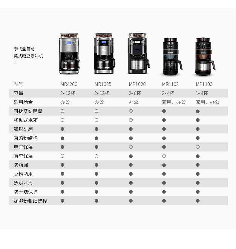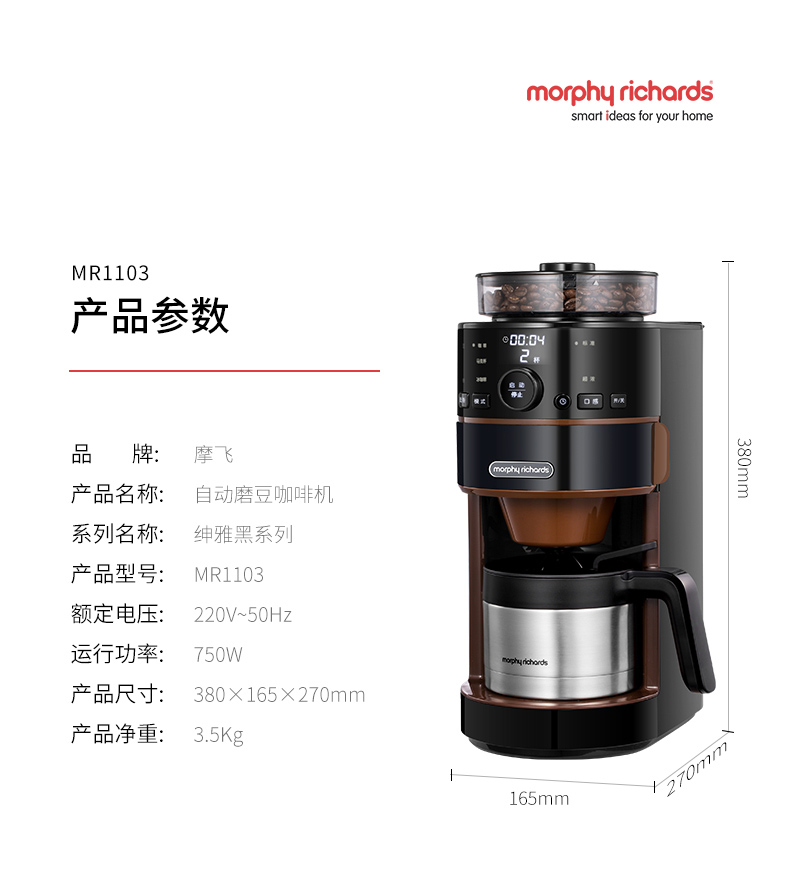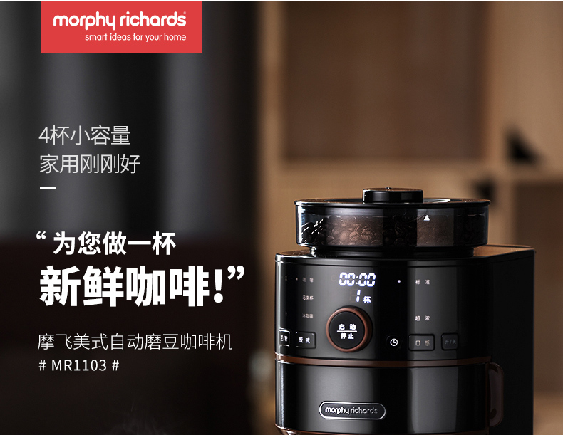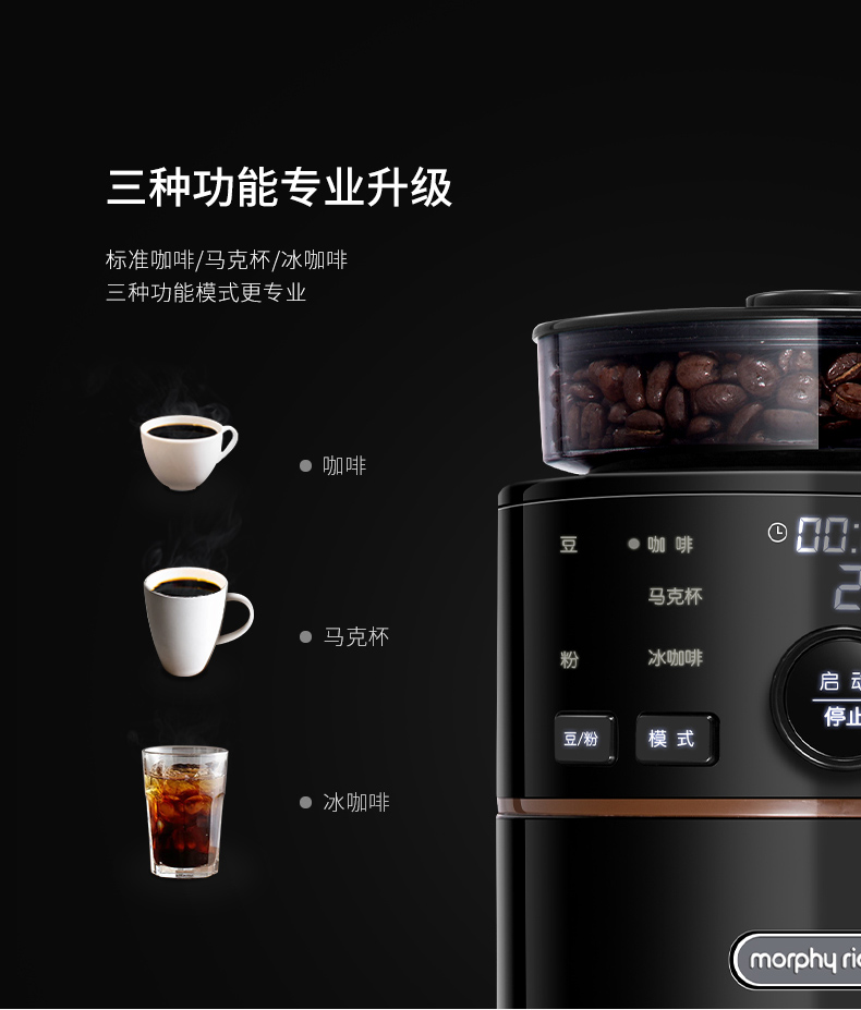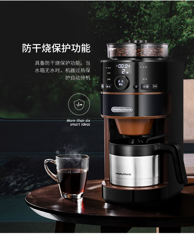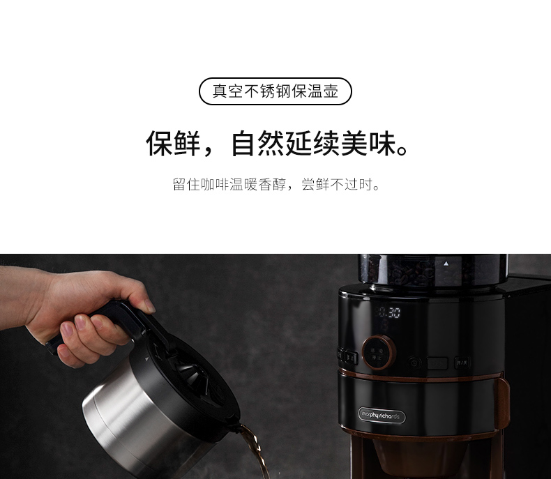 摩飞(Morphyrichards)MR1103咖啡机全自动磨豆家用咖啡机不锈钢保温咖啡壶 豆粉两用