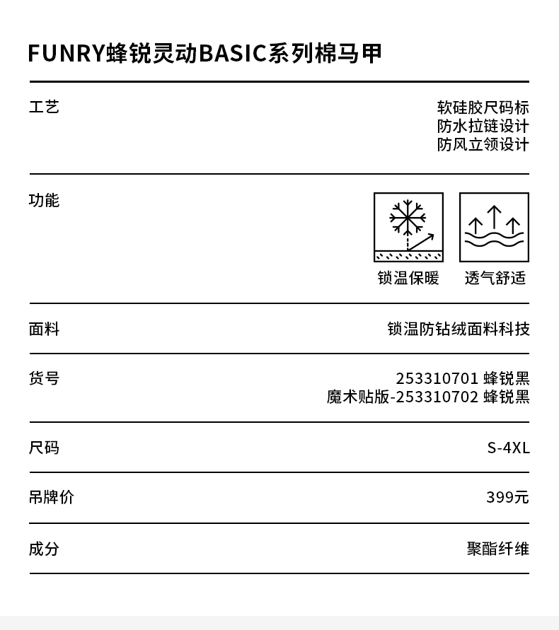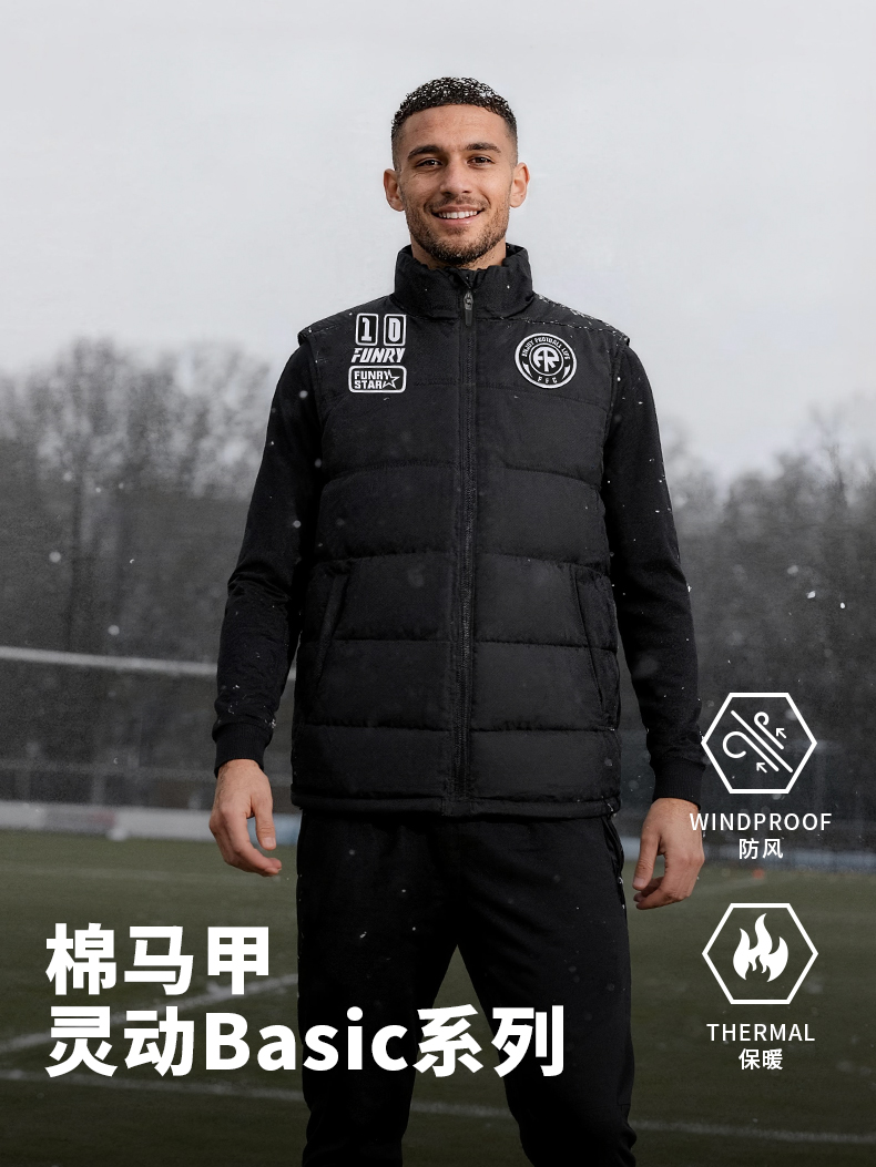 小李子FUNRY蜂锐灵动BASIC系列棉马甲新款成人运动保暖耐磨立领