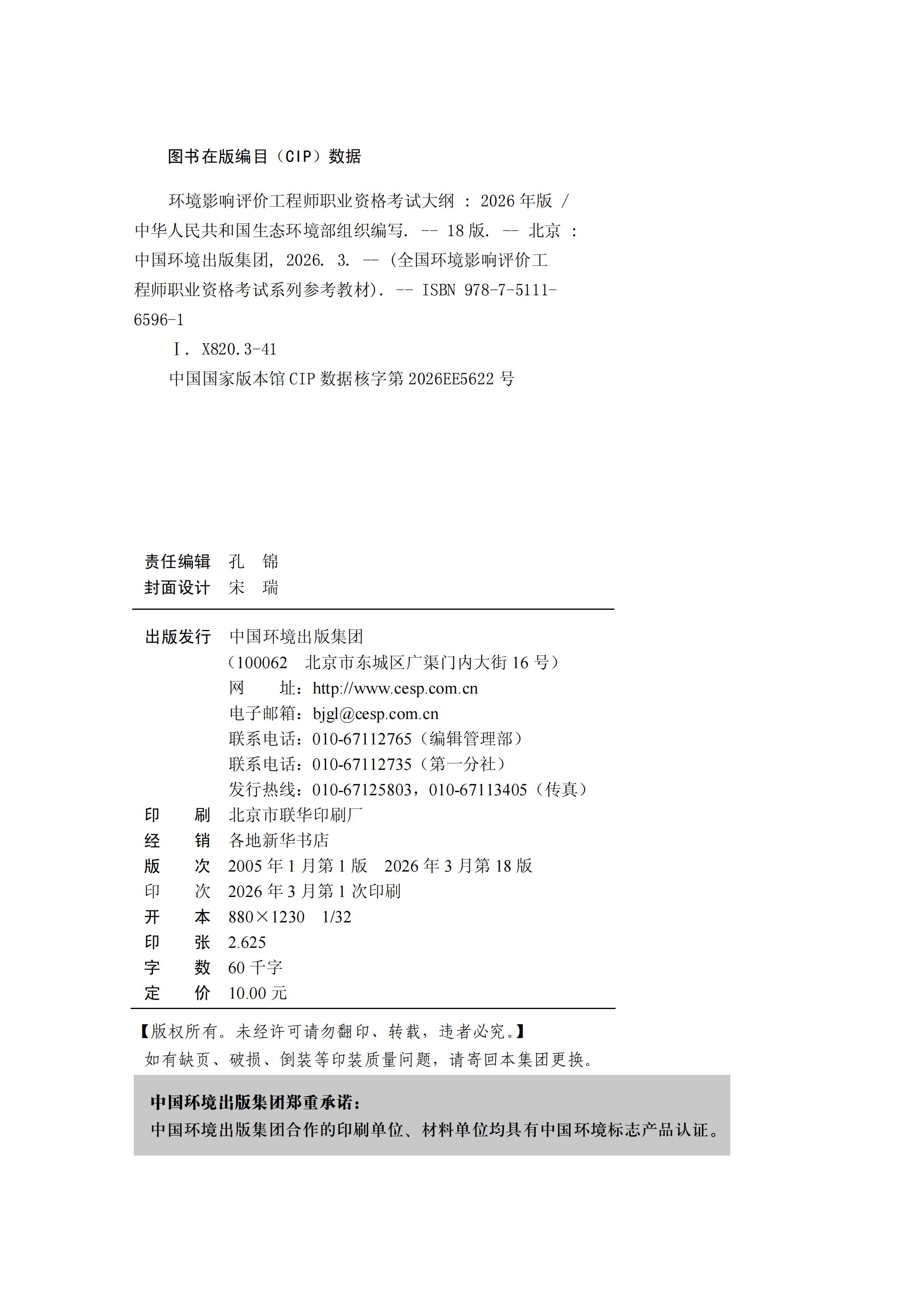 环境影响评价工程师职业资格考试大纲 : 2026 年版978-7-5111- 6596-1