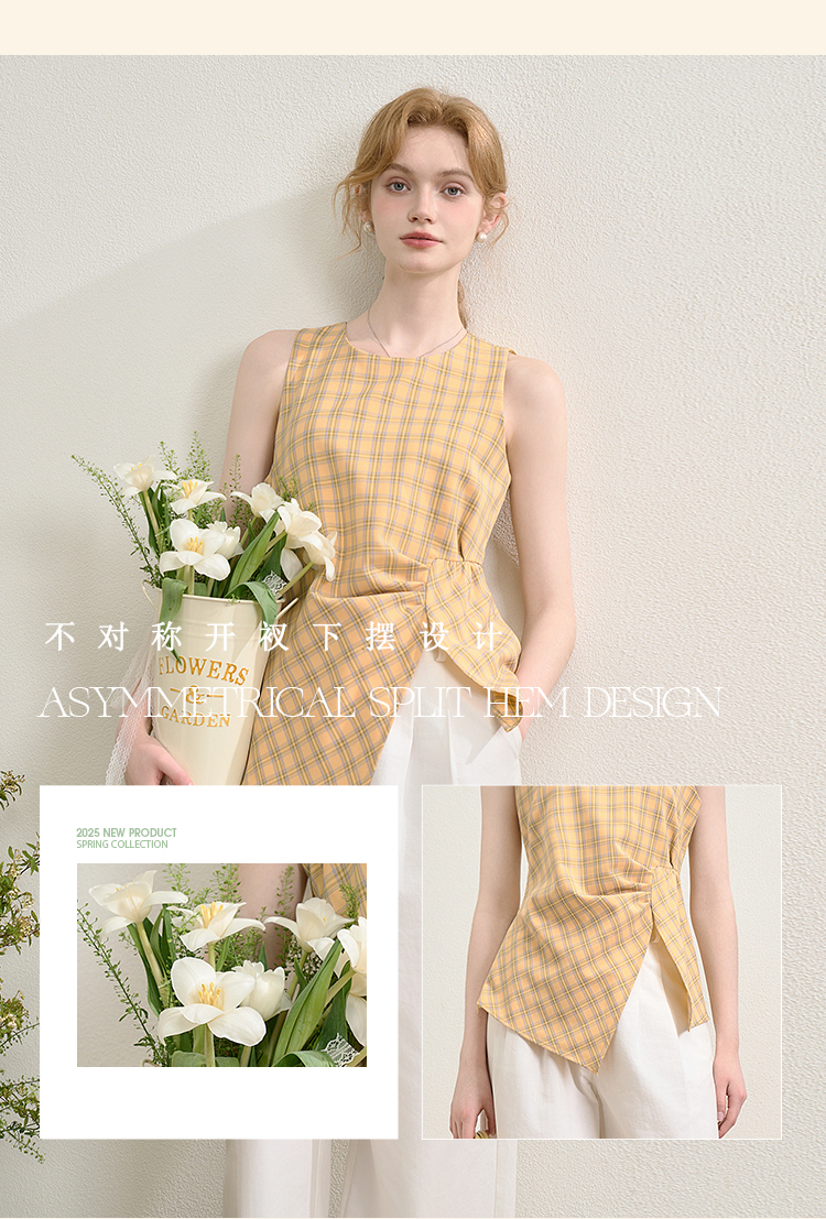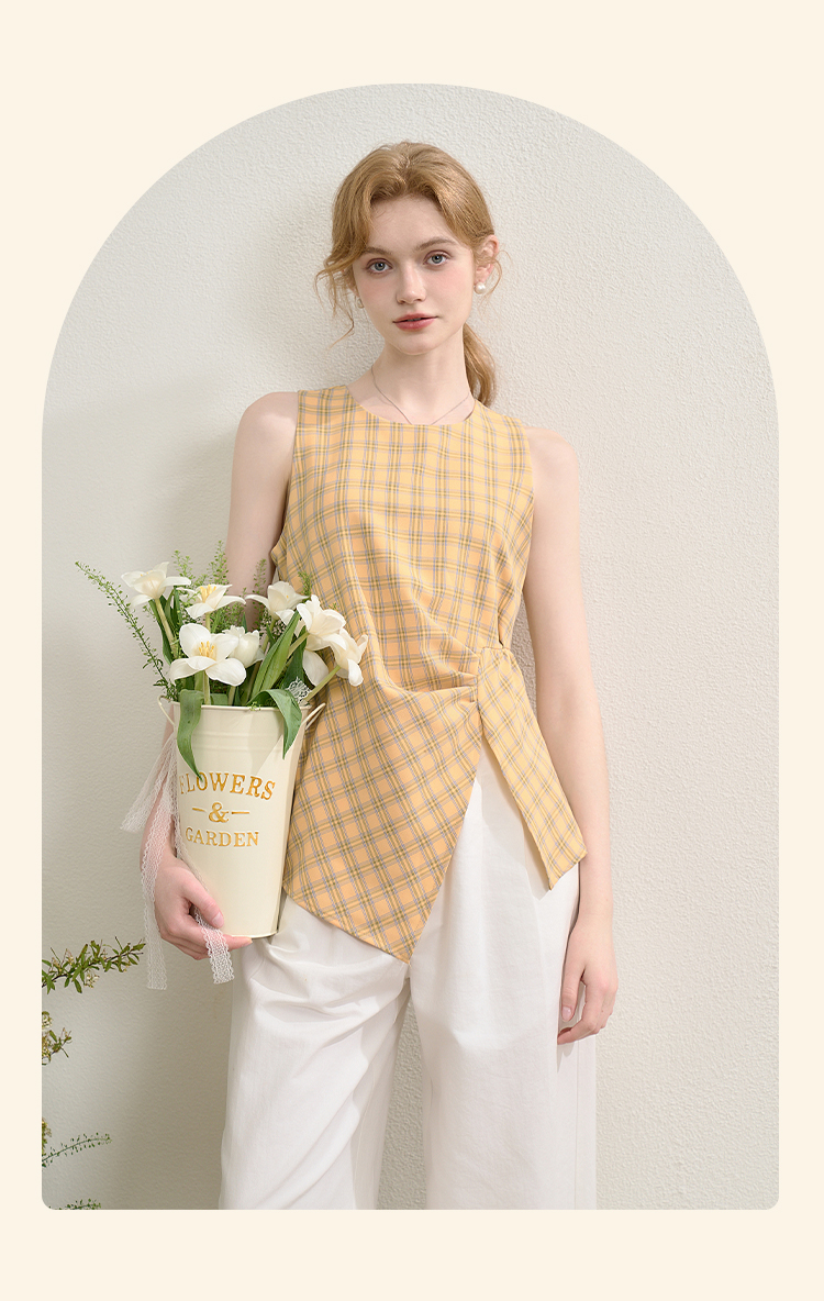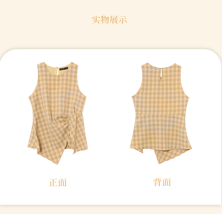 【奶油多巴胺】复古蓝黄格纹衬衫女夏季不规则设计感衬衣V0050802