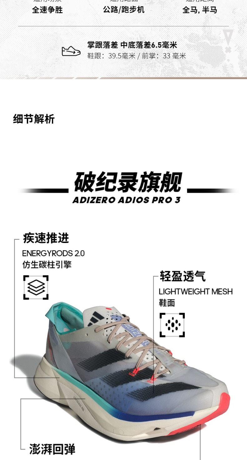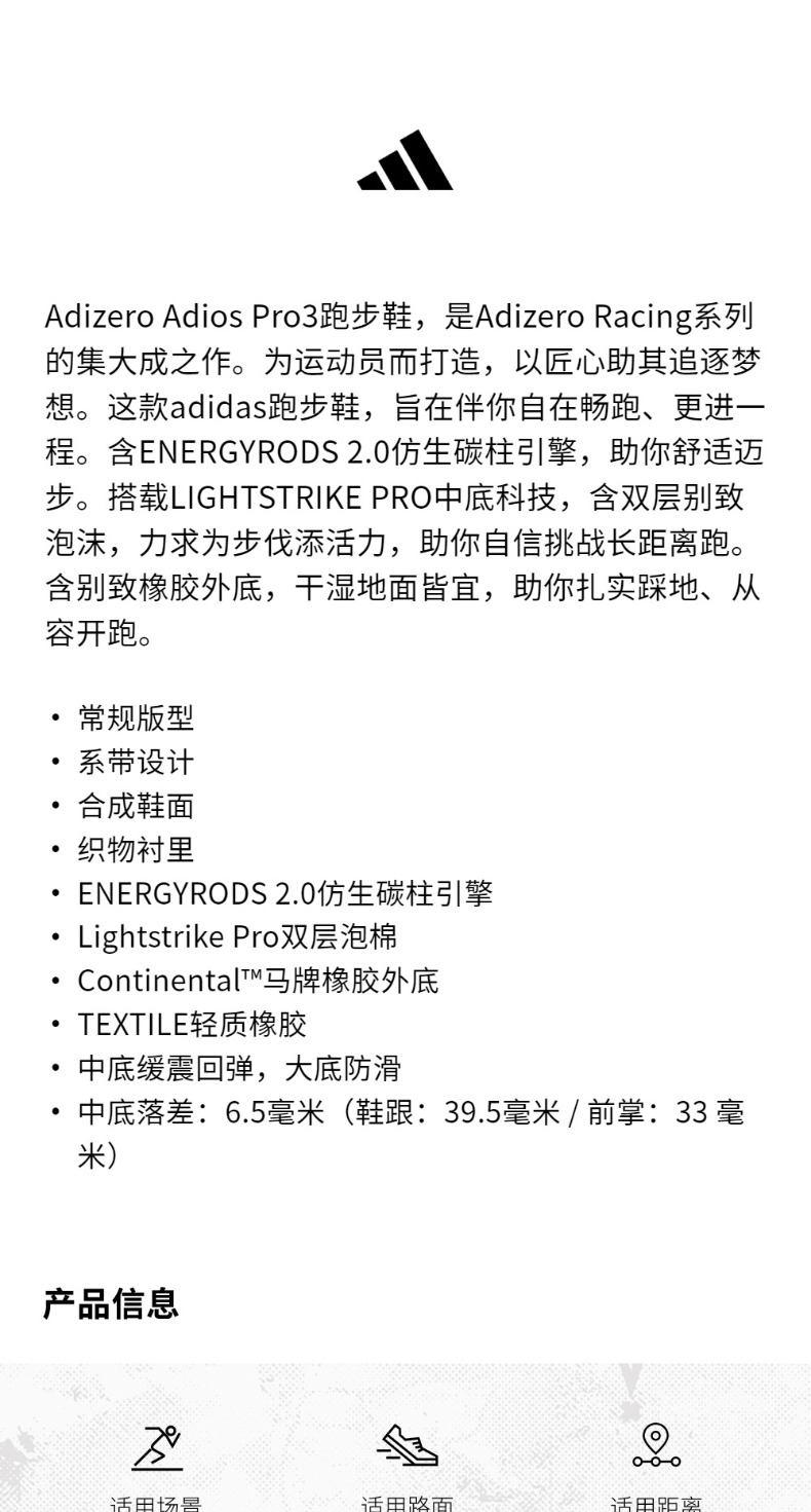 adidas 阿迪达斯 ADIZERO ADIOS PRO 3 全速争胜马拉松碳柱碳板跑鞋