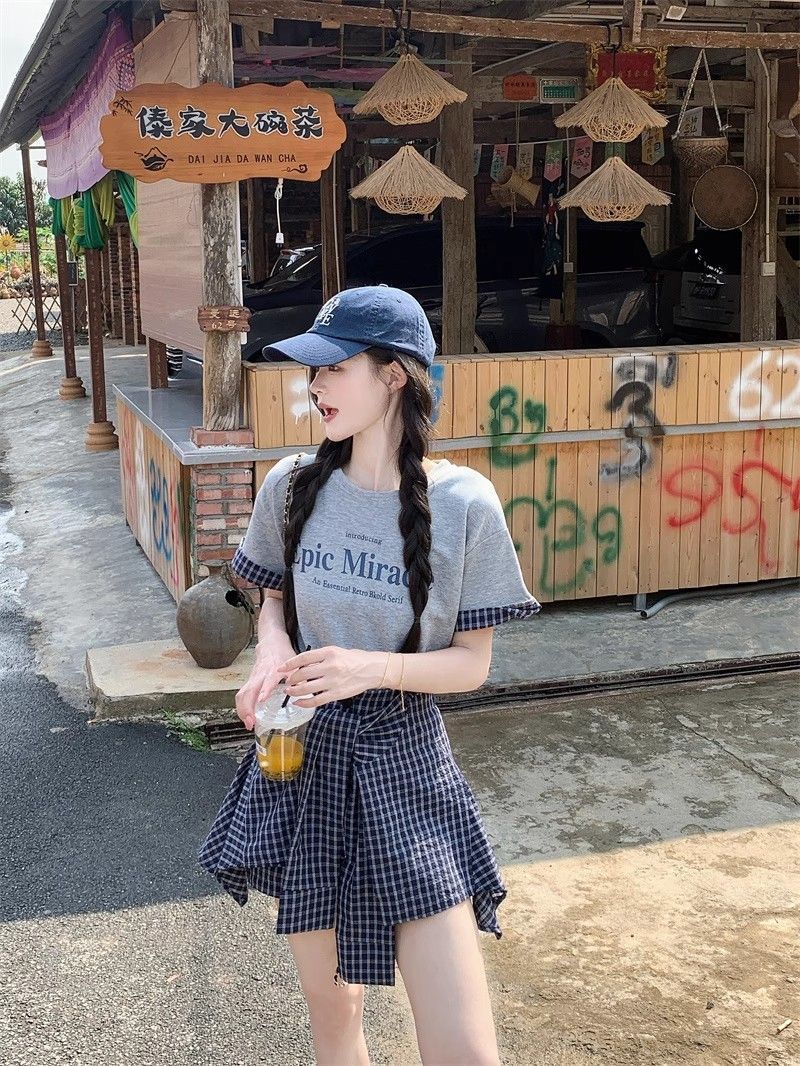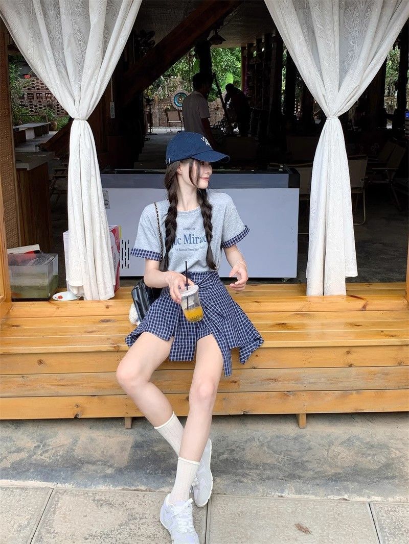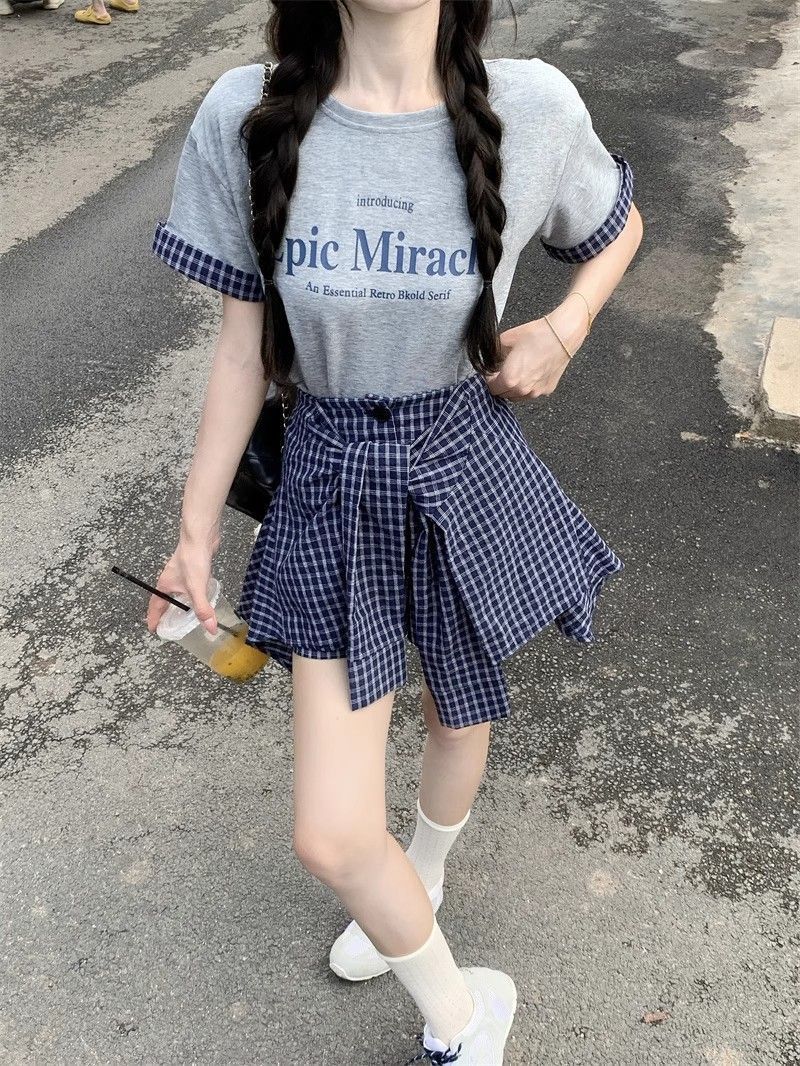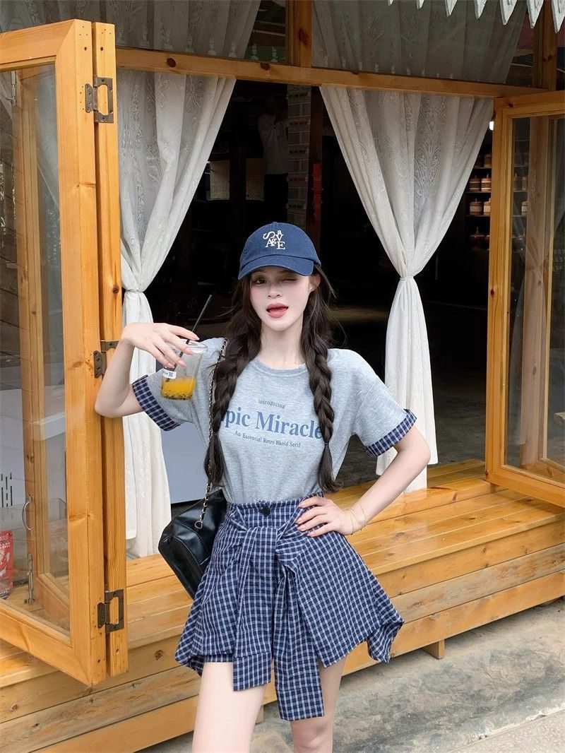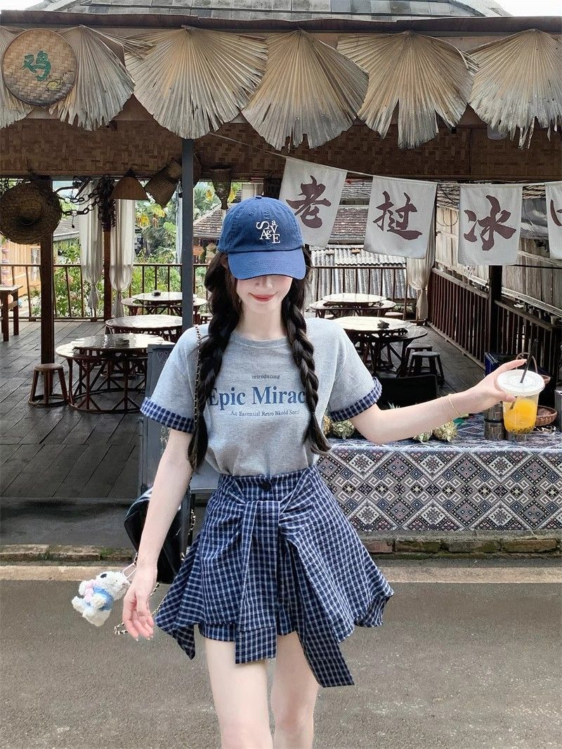 新款 大码套装 复古套装字母印花短袖t恤 女夏季格子不规则半身裙两件套