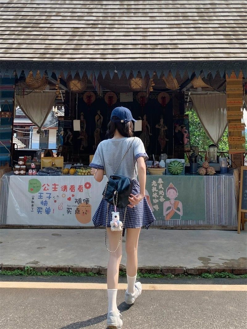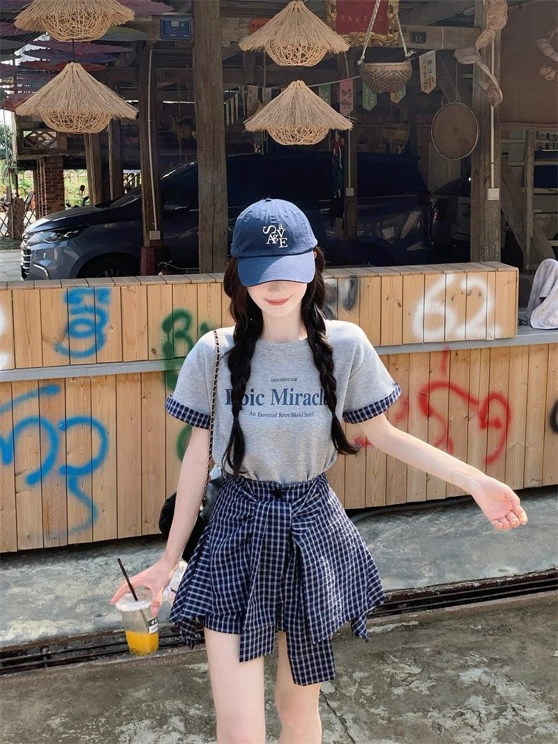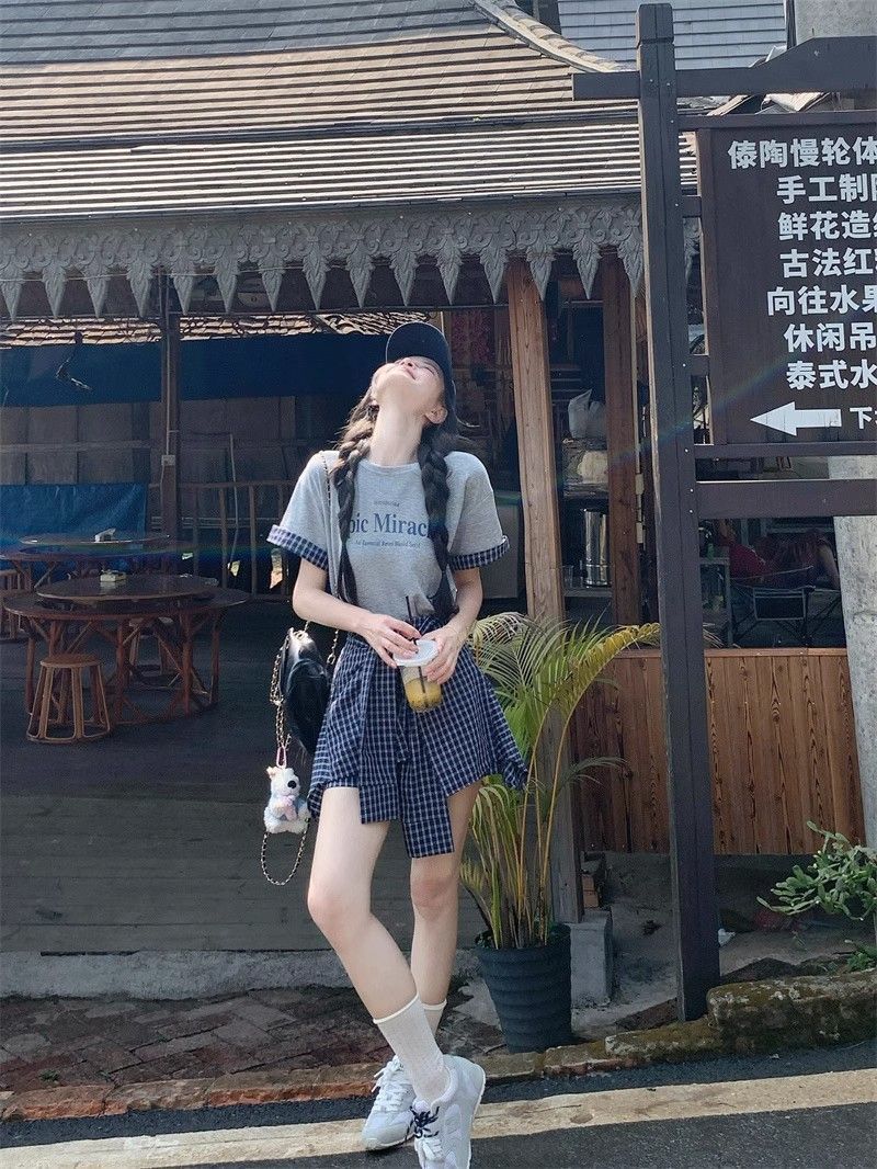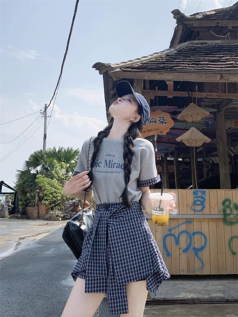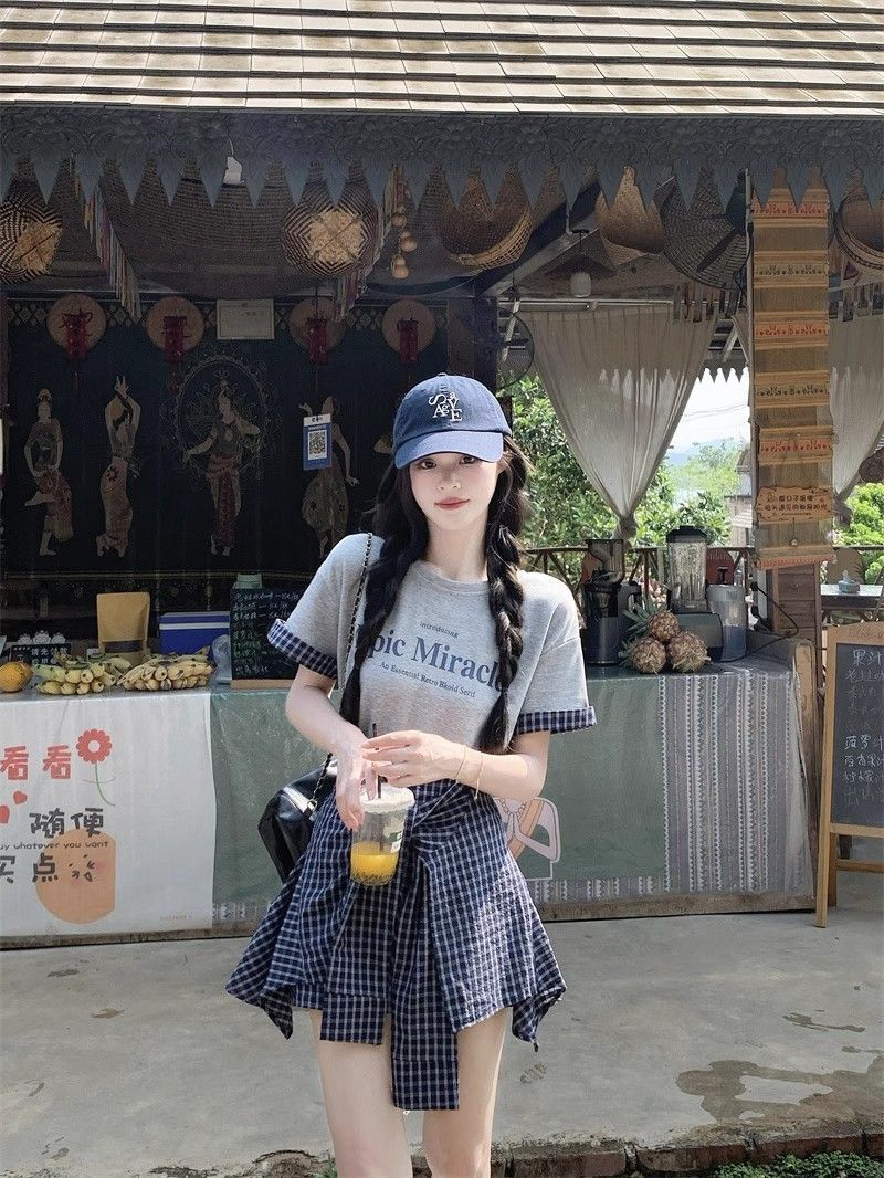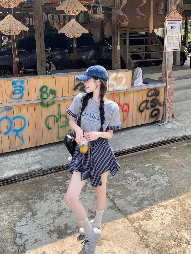 新款 大码套装 复古套装字母印花短袖t恤 女夏季格子不规则半身裙两件套