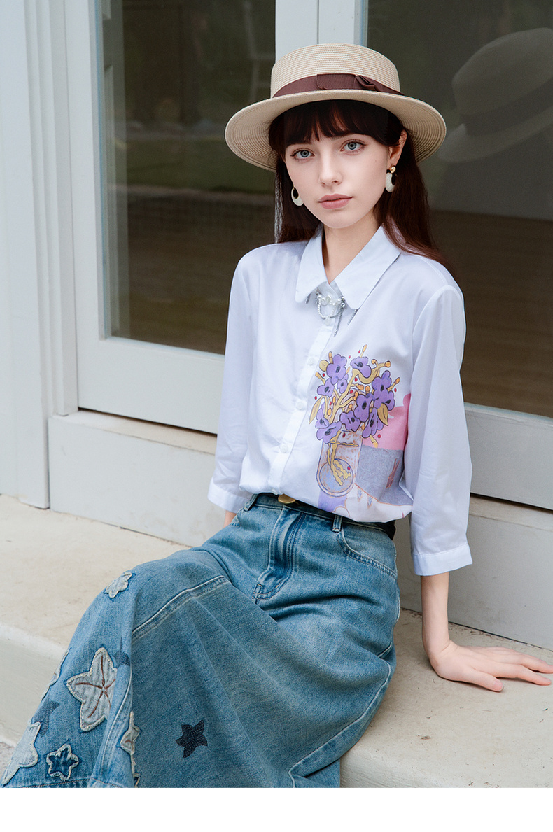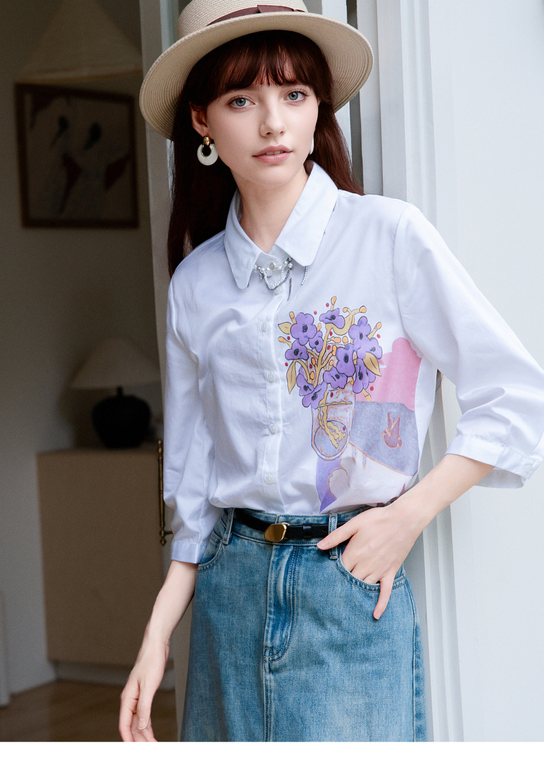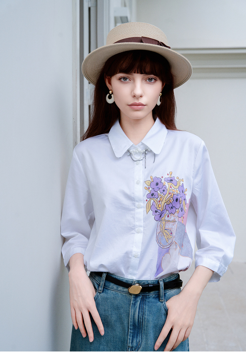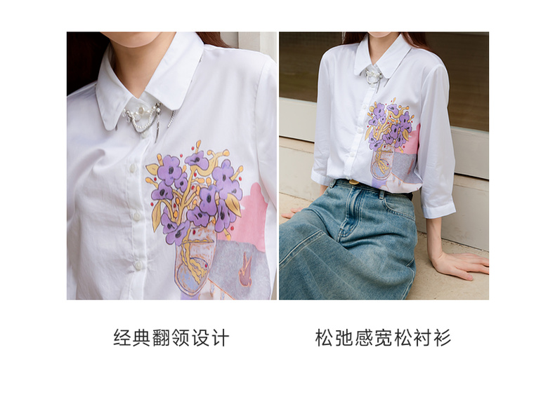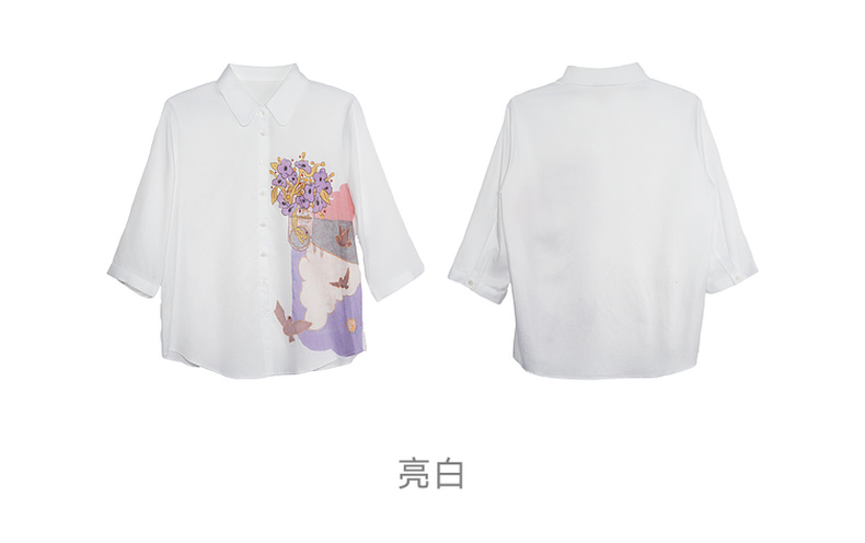 谜底白衬衫七分袖女士2025夏季新款通勤风印花合体衬衣256MC6246