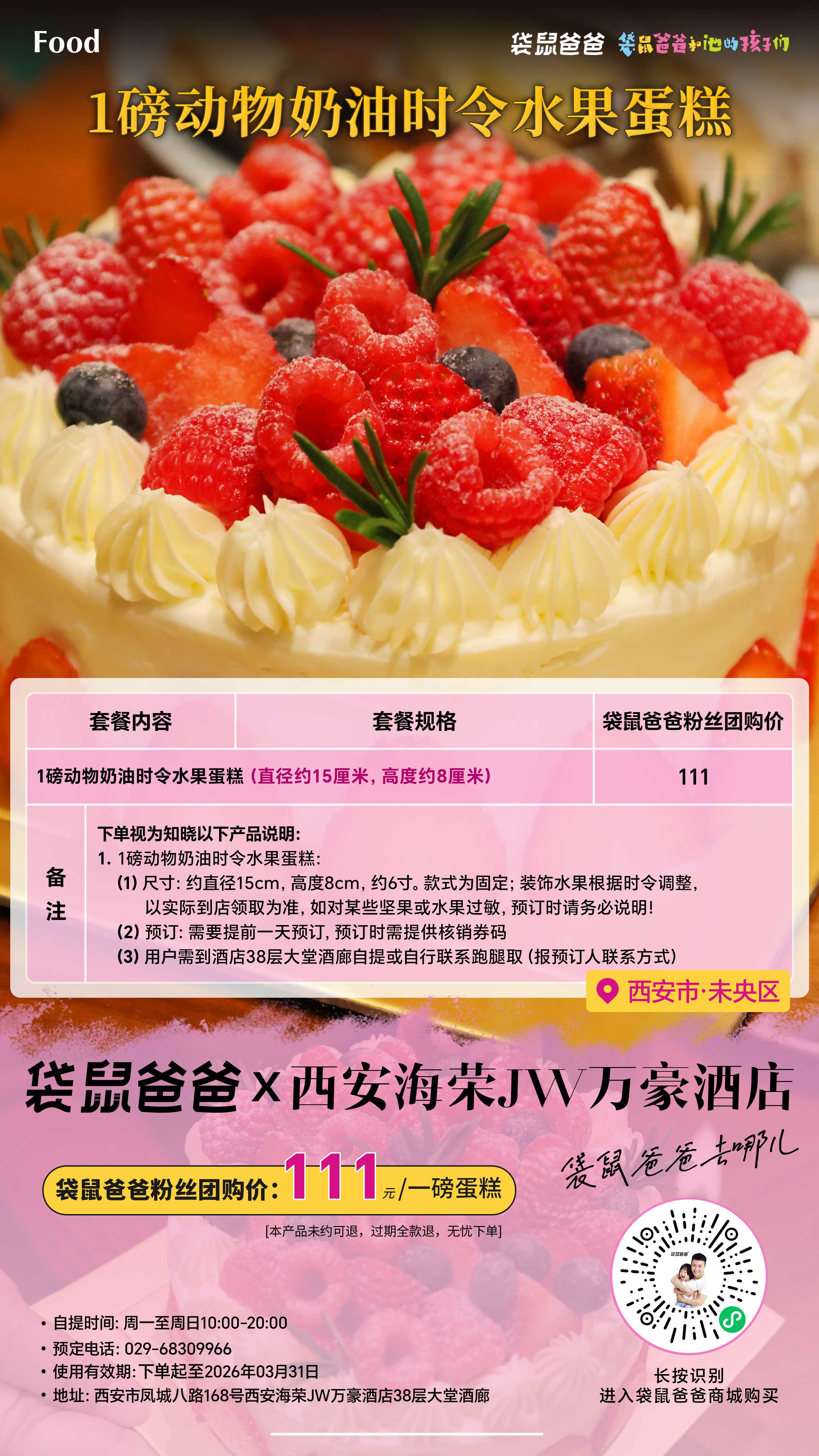 套餐名称:西安海荣JW万豪酒店【1磅动物奶油时令水果蛋糕】(需自提)