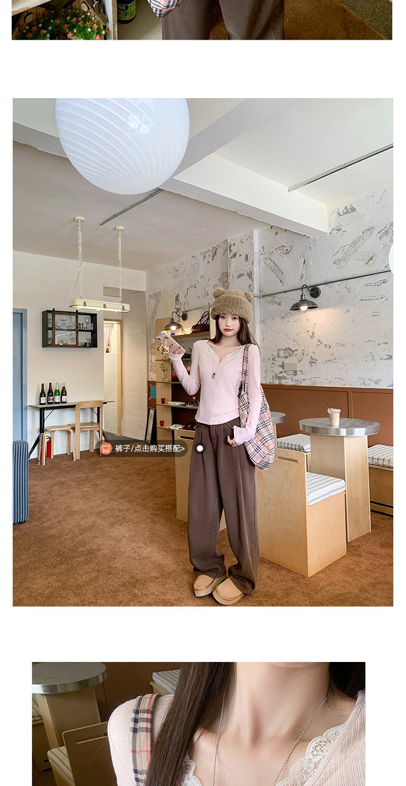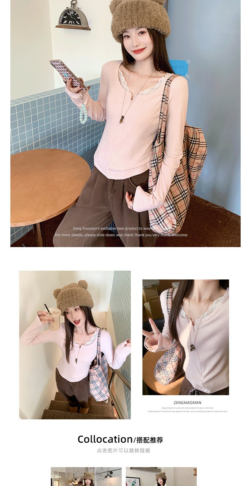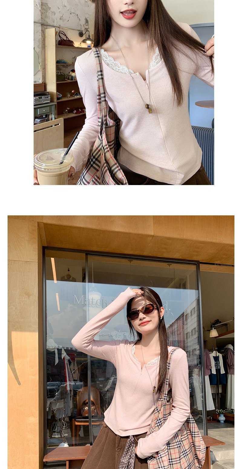 【129元任选2件】现货韩系粉色蕾丝边长袖t
