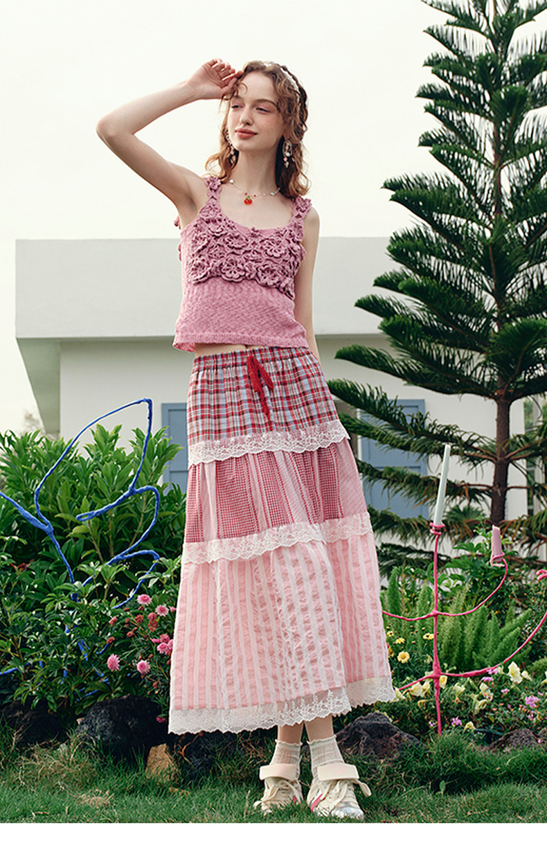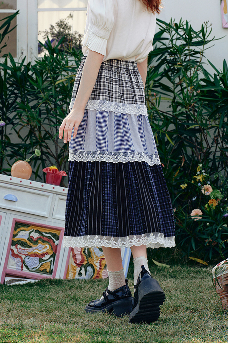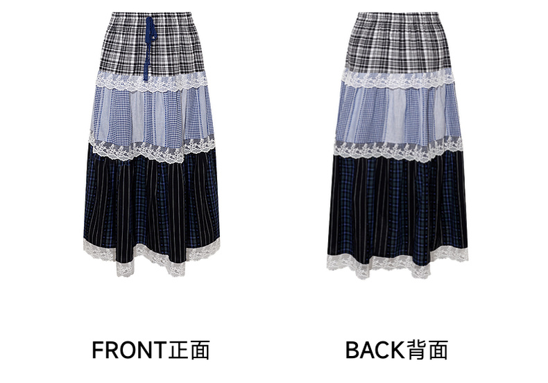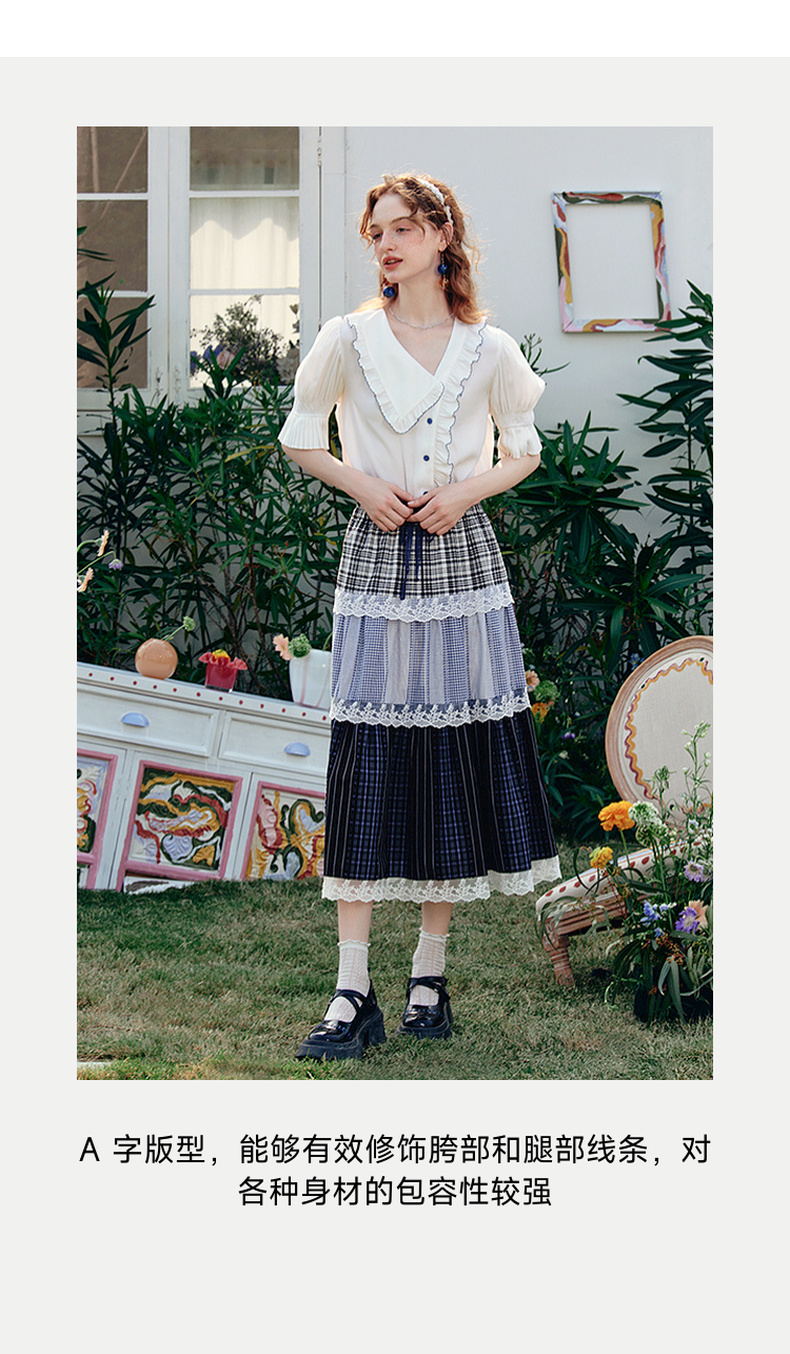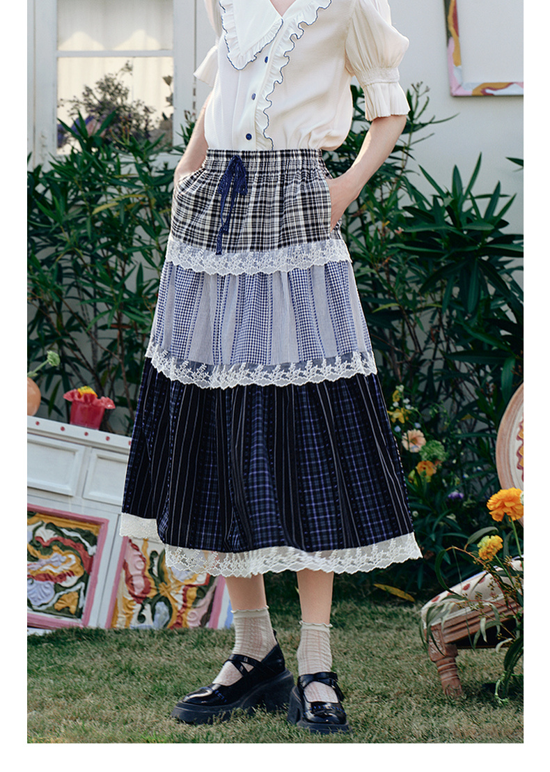 两三事 倒流梦境 2025夏季新款小清新蕾丝拼接格子绑带高腰半身裙
