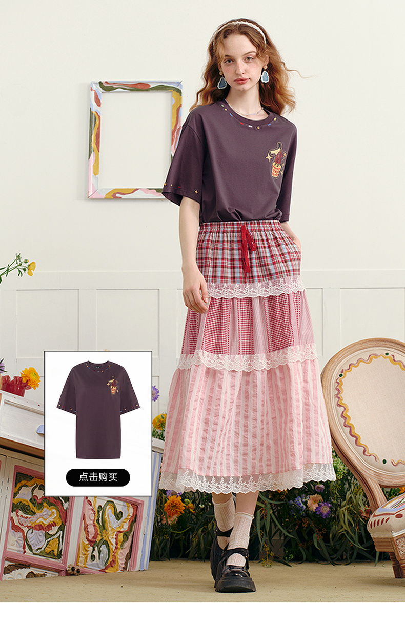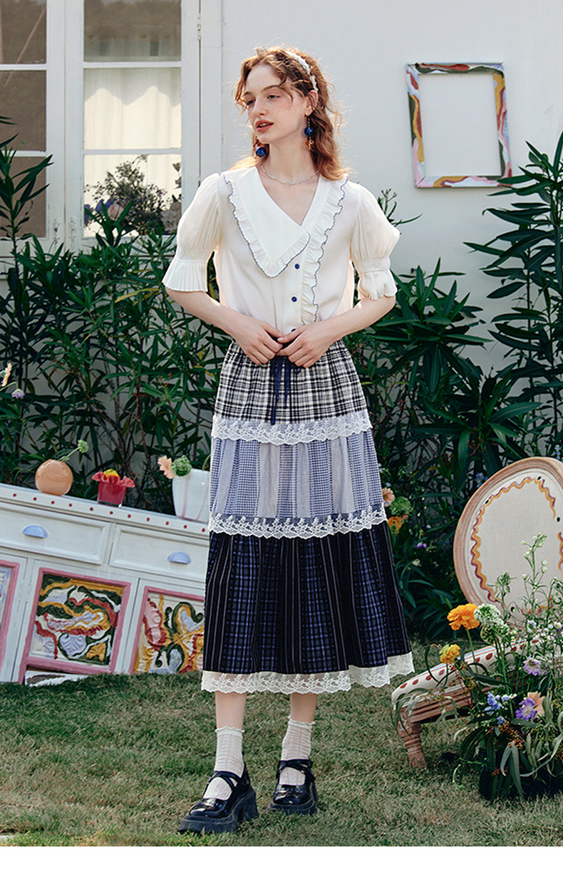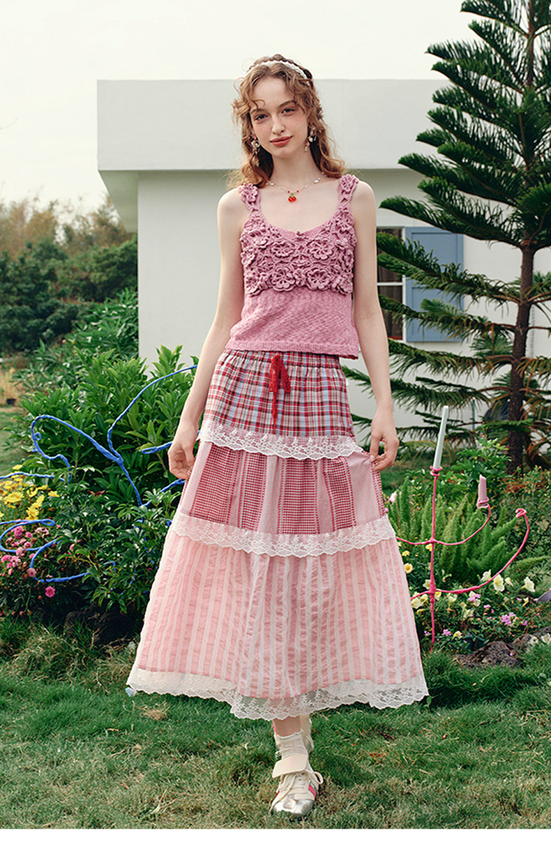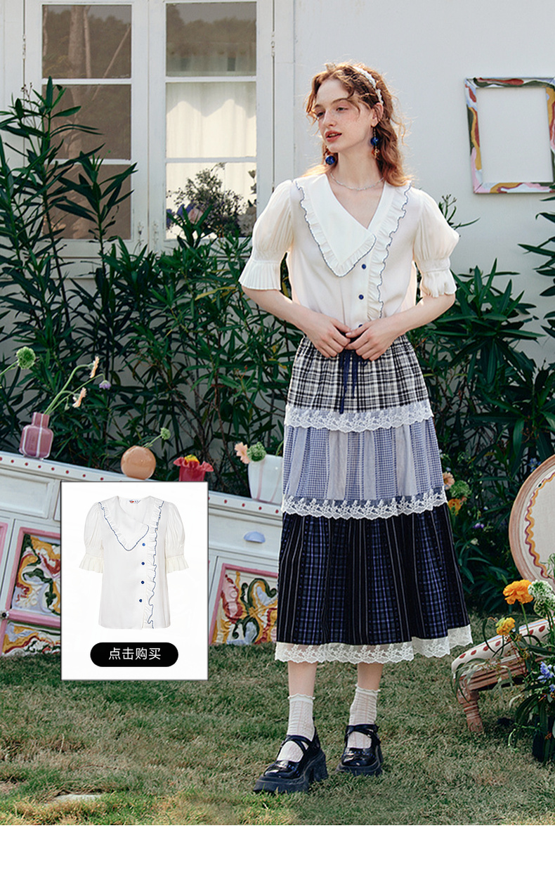 两三事 倒流梦境 2025夏季新款小清新蕾丝拼接格子绑带高腰半身裙
