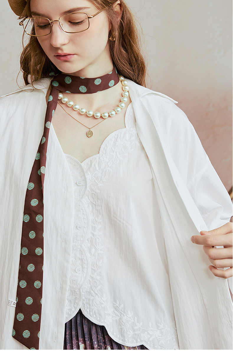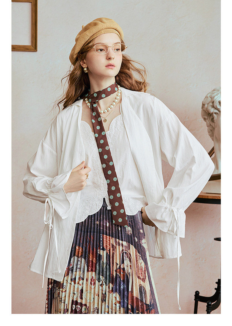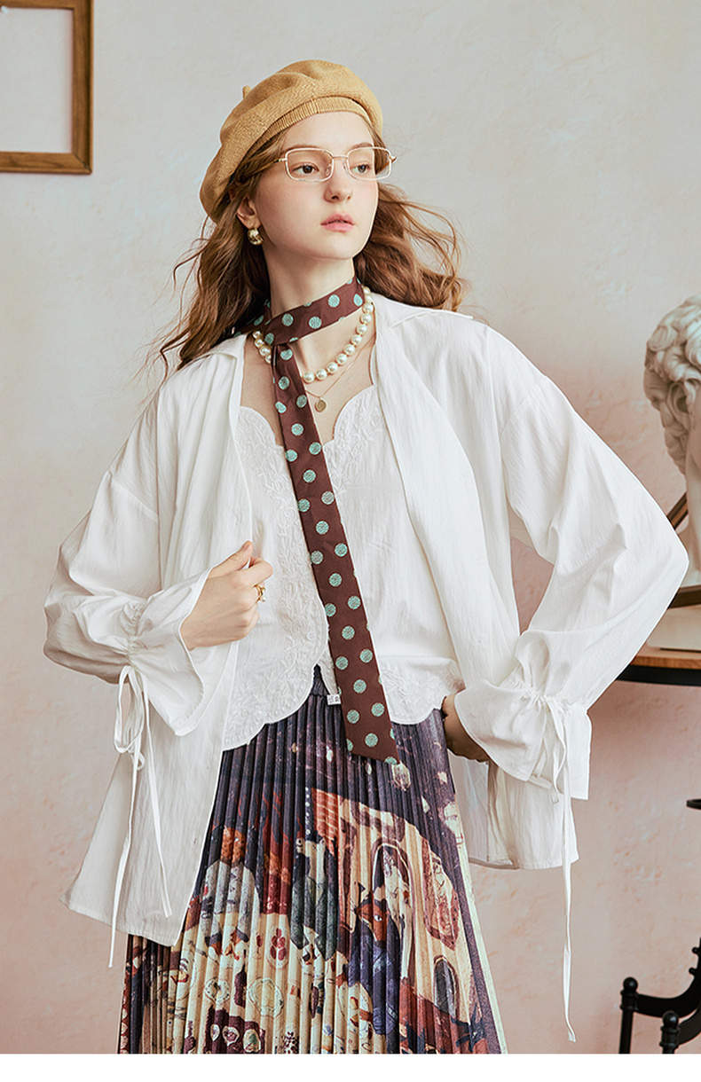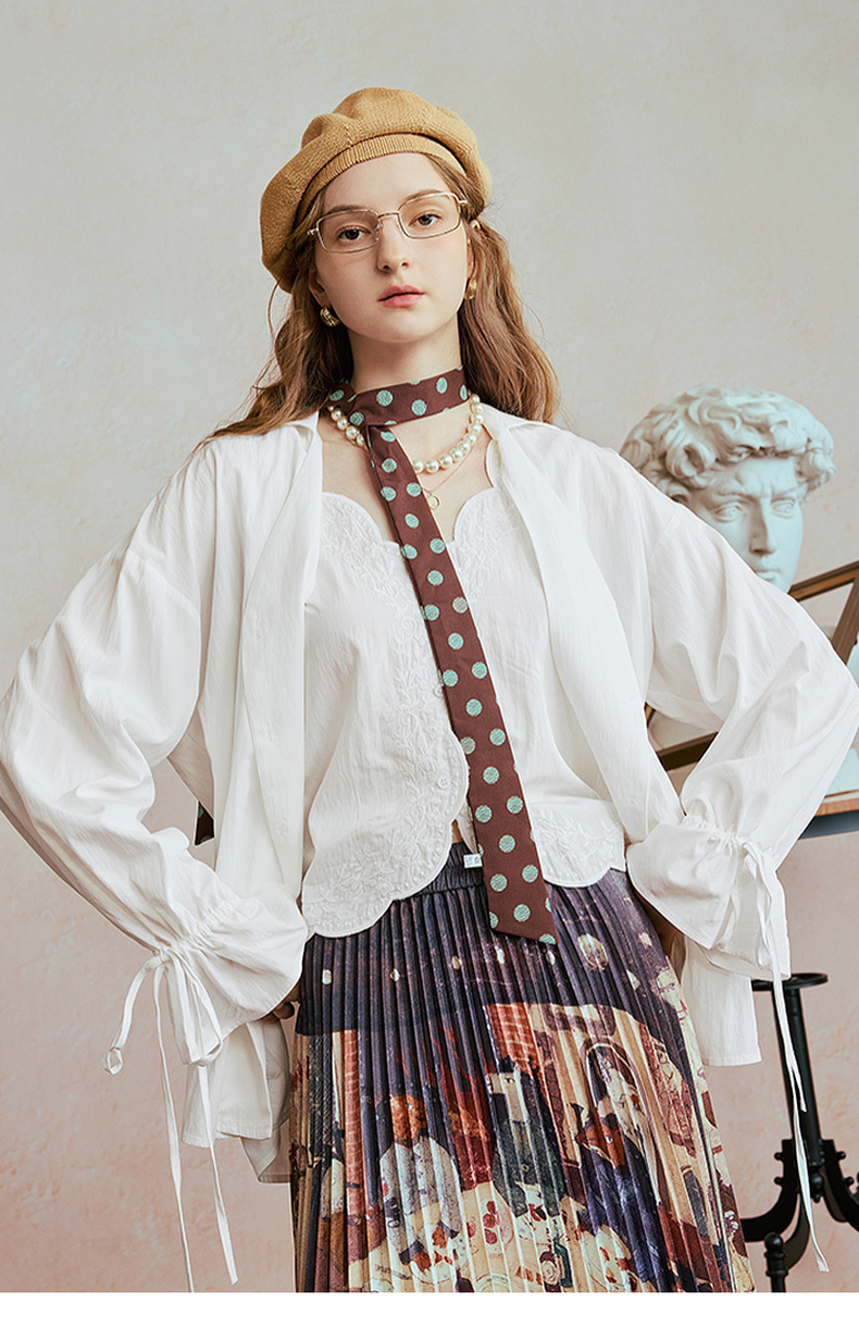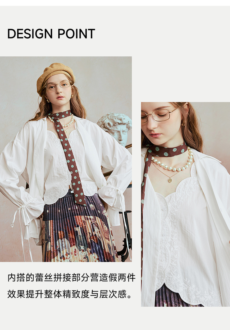 两三事 日光流年 2025秋季新款复古刺绣拼接假两件绑带长袖衬衫女