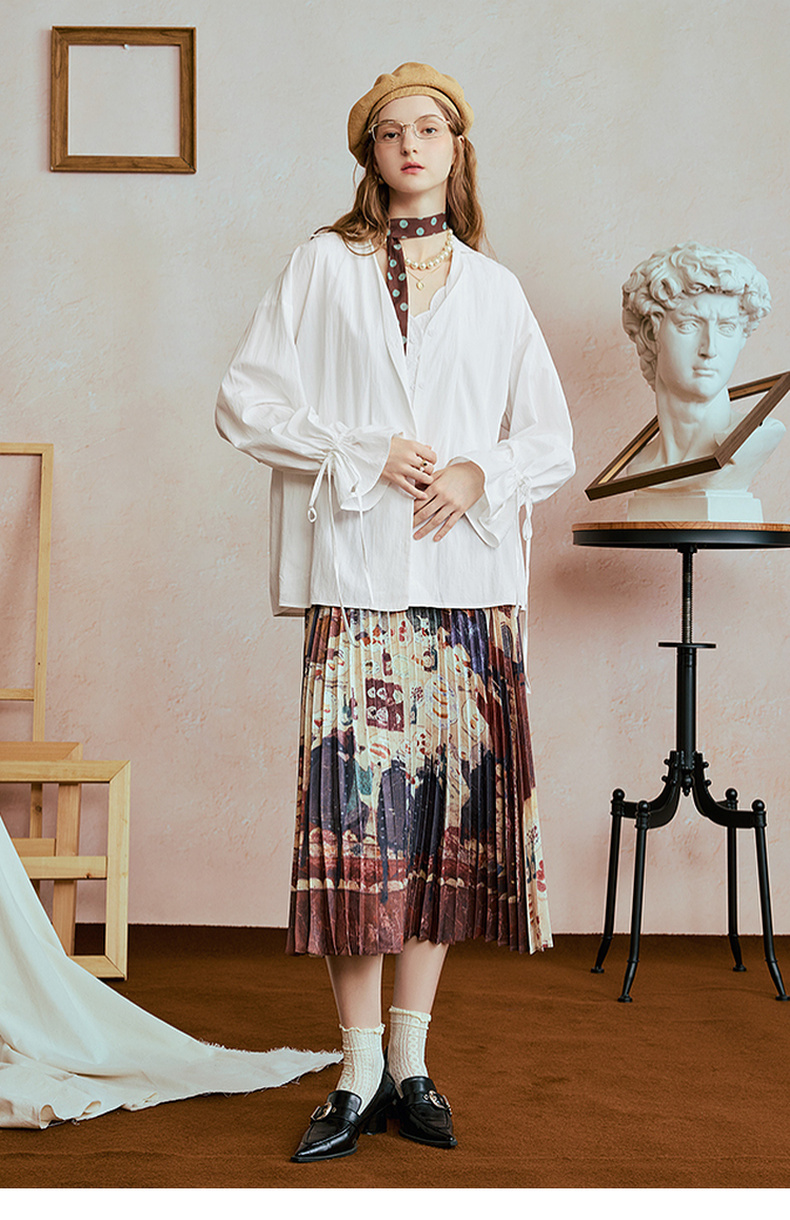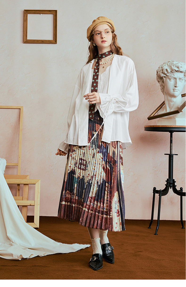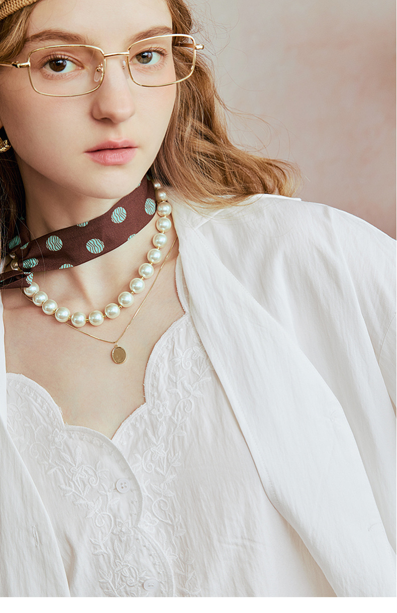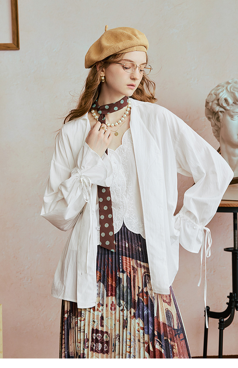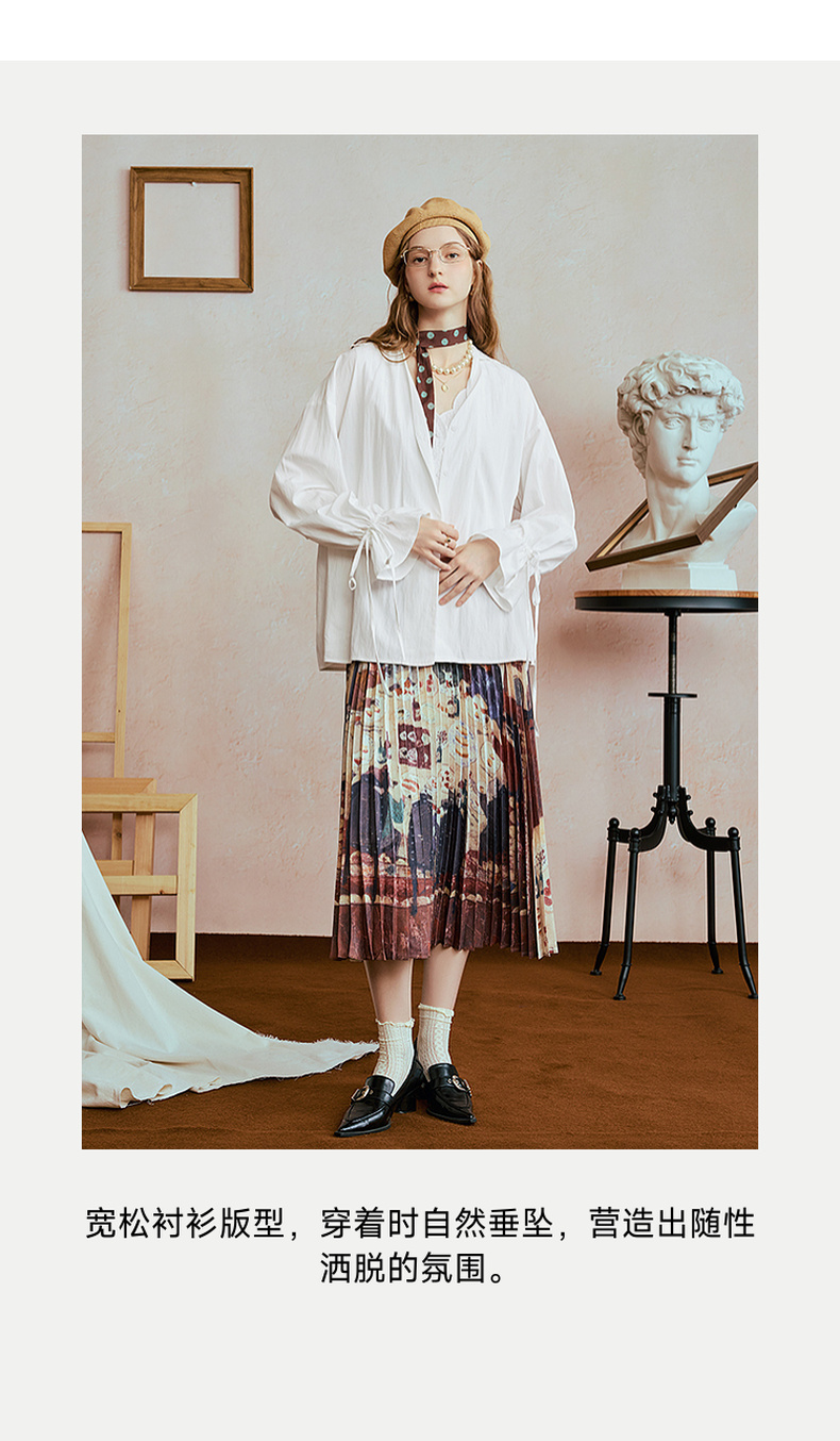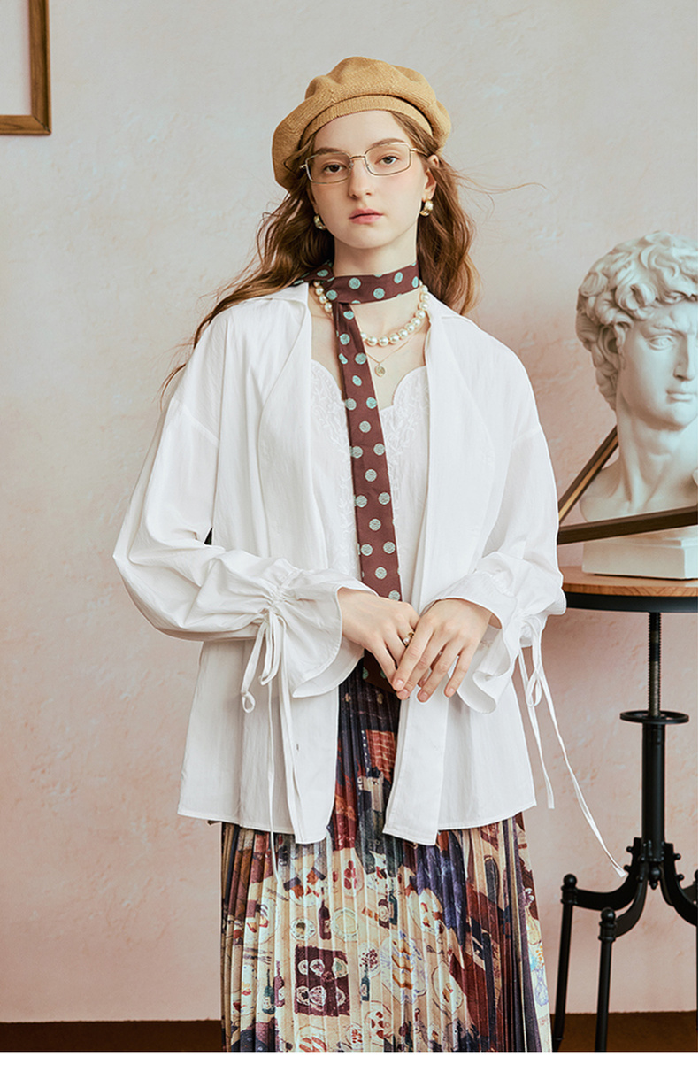 两三事 日光流年 2025秋季新款复古刺绣拼接假两件绑带长袖衬衫女