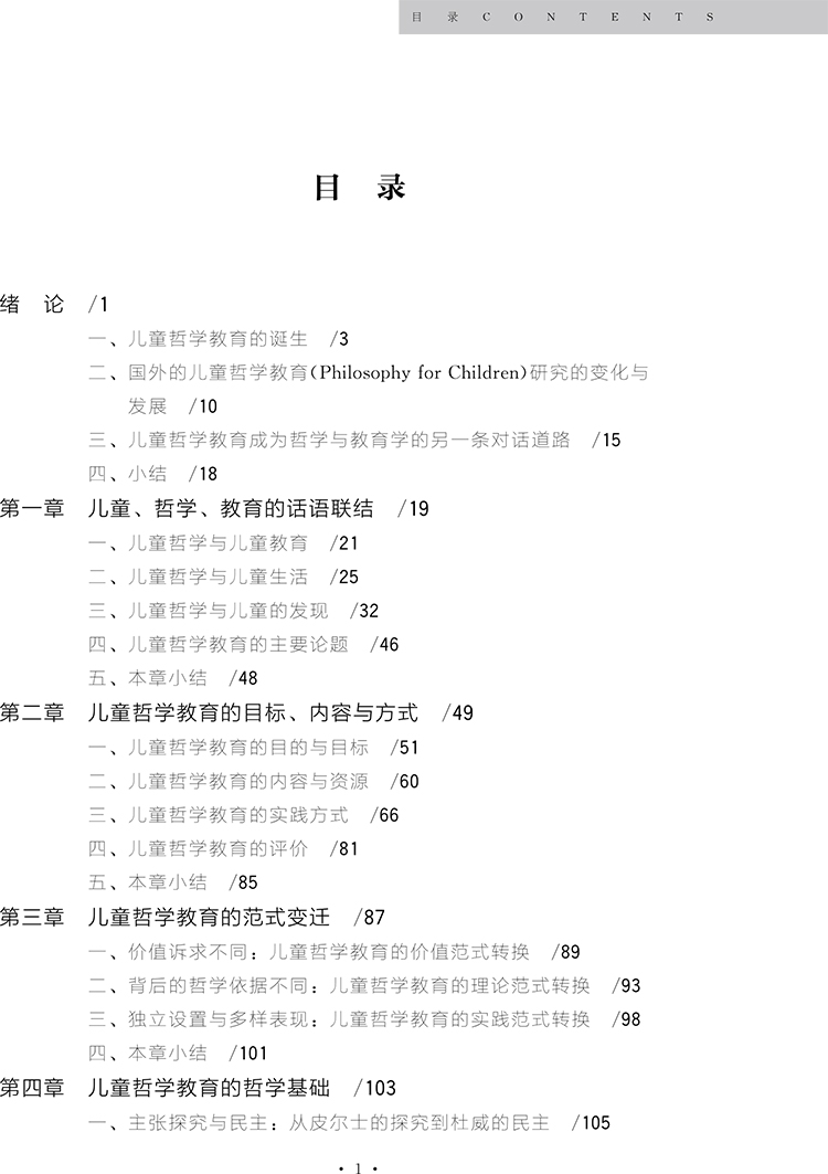 本书主要分为八个部分,由绪论、七章具体内容和结语构成,主要讨论了儿童哲学教育的诞生问题、儿童哲学在国外的研究变化与发展情况以及研究者还从阐明儿童哲学已经成为哲学与教育学相结合发展的令一条道路,并分别从哲学的视角、教育学的视角以及哲学与教育学相结合的中介视角说明当前儿童哲学的发展现状。本书从思想构成的前提上挖掘了儿童哲学教育的哲学前提,对哲学前提进行了系统性的挖掘和梳理,为儿童哲学教育的理论发展提供了可能的创新点;重构了儿童哲学教育的儿童观,对思考当前教育理论与实践问题提供了新的视角;把儿童哲学教育与学科教学结合起来,提出了新的儿童哲学实践之路。