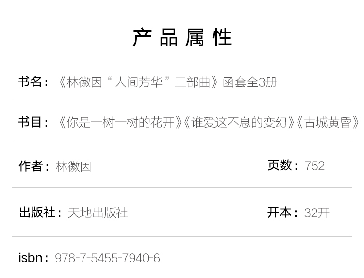 全书共有《你是一树一树的花开》《谁爱这不息的变幻》《古城黄昏》三册,囊括了林徽因一生中绝大部分经典,包含诗歌、戏剧、译文、散文、小说、评论、书信、建筑文化等。