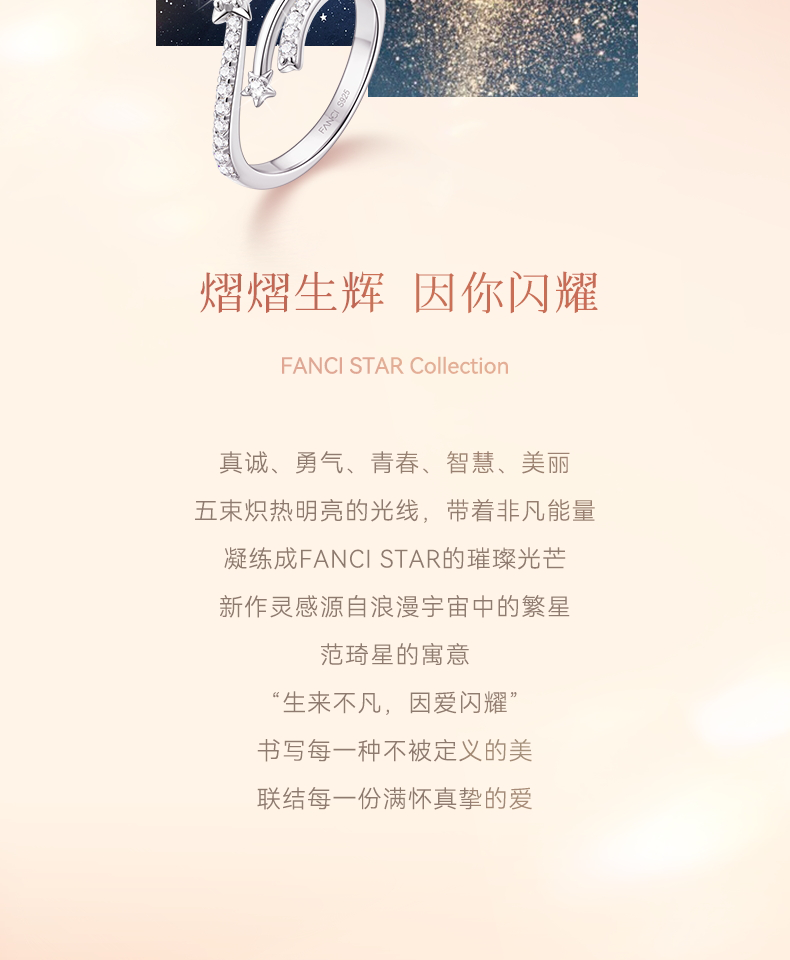 FANCI范琦始于2012年,以珠宝表达内心为初衷,聚焦不同亲密关系情感表达,联结无形情感,以情感符号「I FANCI U」传情达意,诠释“恋爱戴范琦,起点是你,终点亦是你”始终如一的恋爱价值观。
