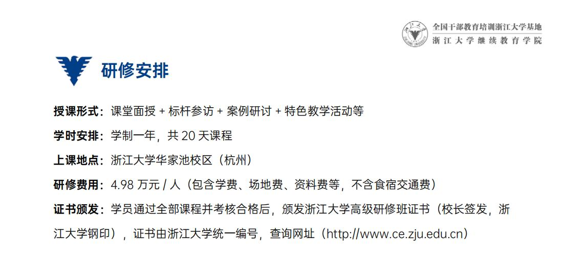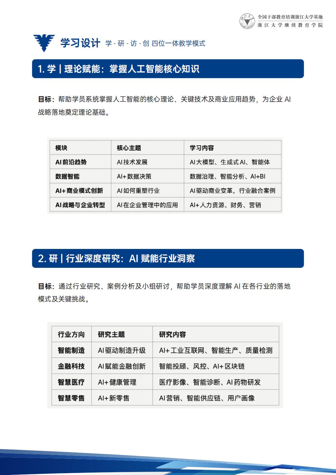 ●课程亮点:浙大权威课程深度赋能,「学研访创」四位一体实战教学;构建AI战略思维,解锁降本增效新范式;打通产学研资源,抢占行业新赛道制高点