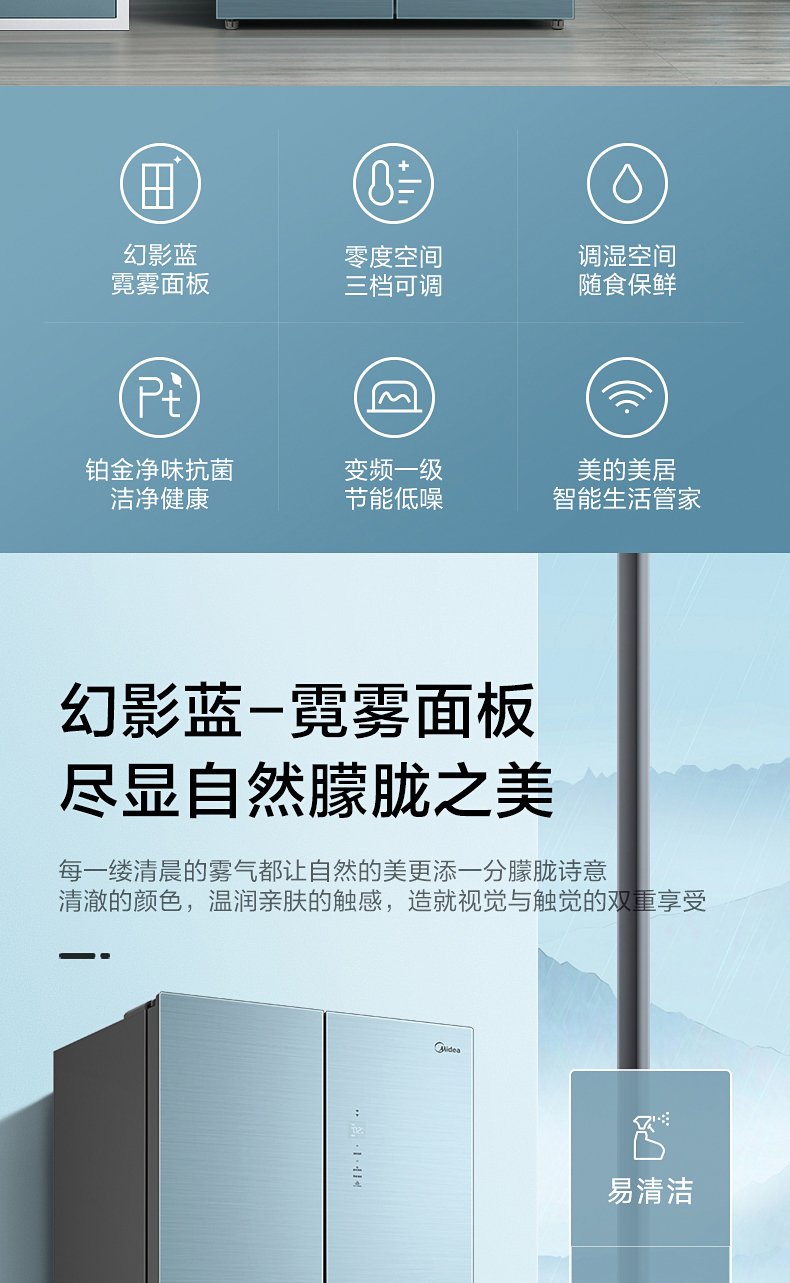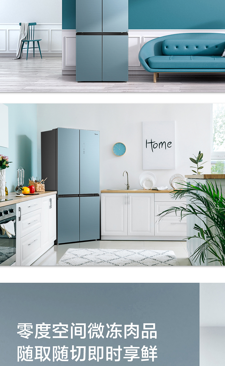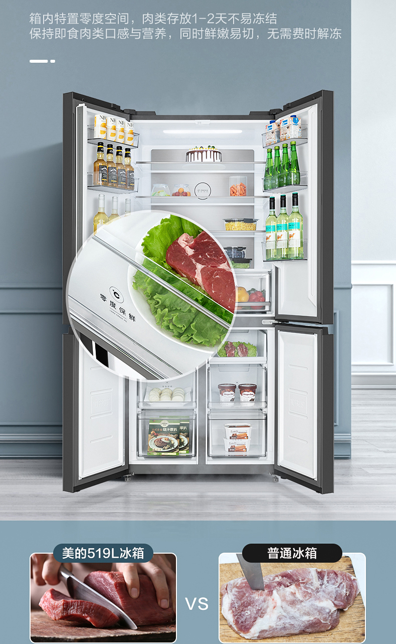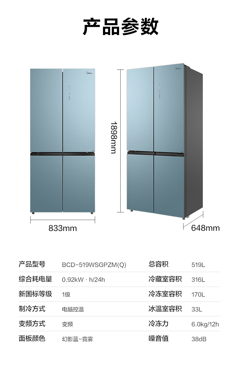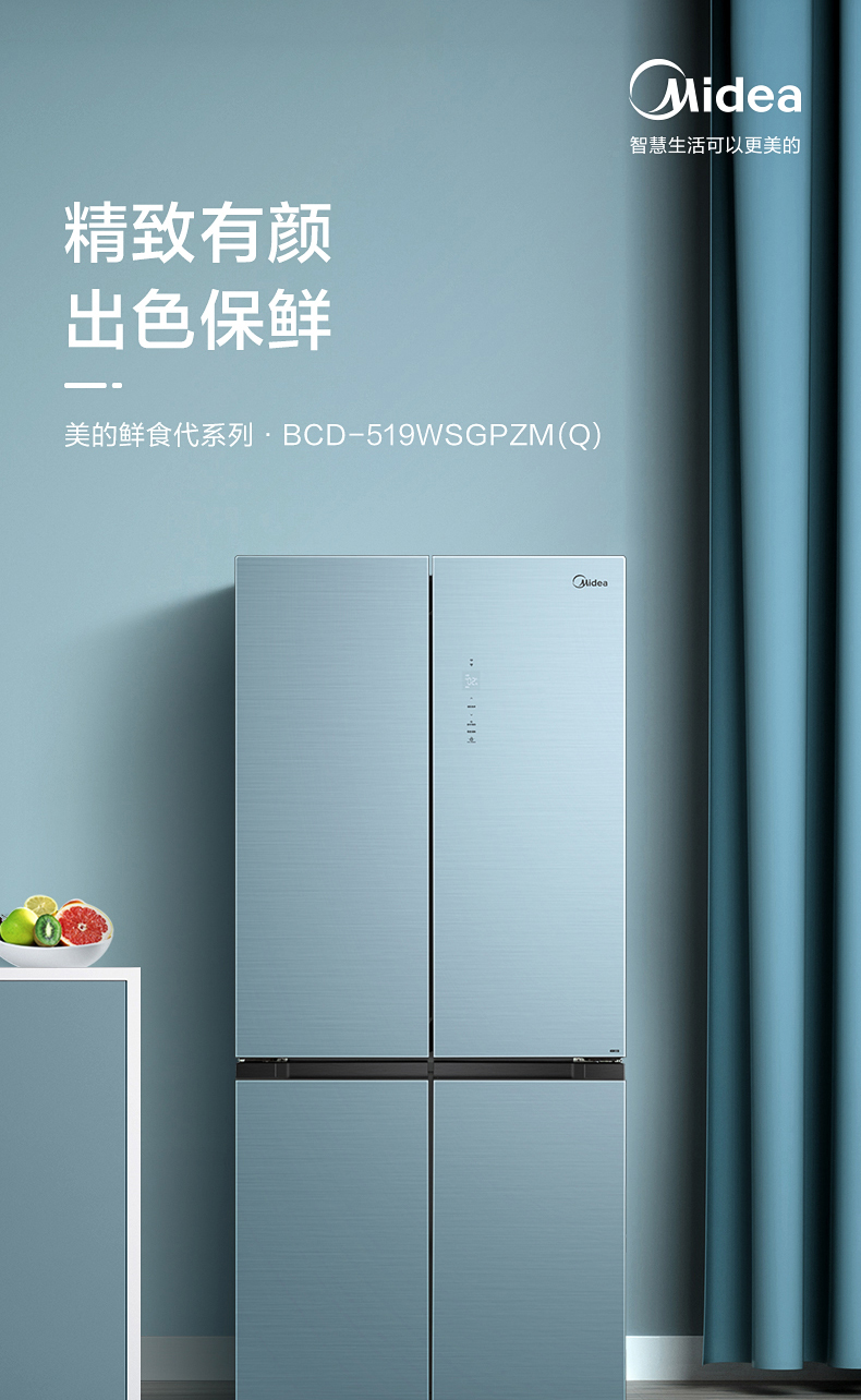 美的十字对开门电冰箱一级智能家电家用大容量冰箱 幻影蓝霓雾BCD-519WSGPZM(Q)