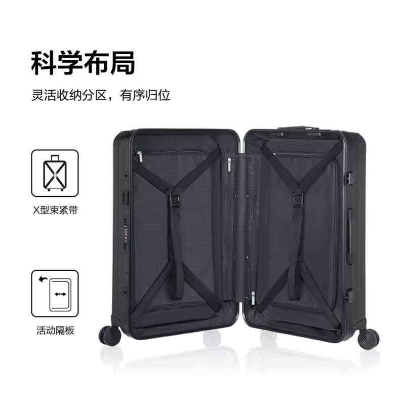 细节:28寸新秀丽铝镁合金拉杆箱,选用7系航空铝材,明星同款。双面活动挡板内里。