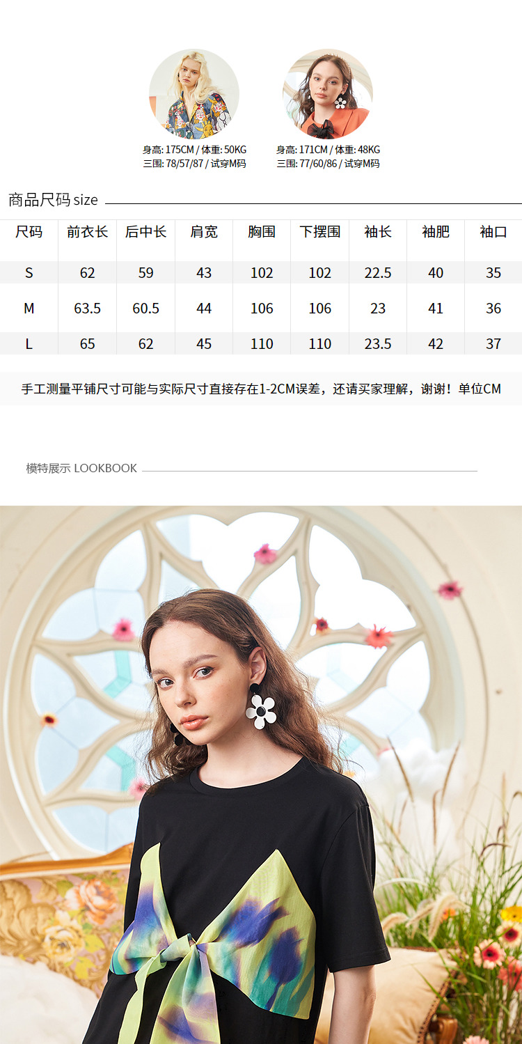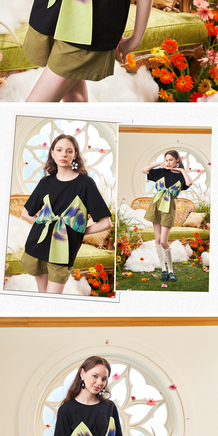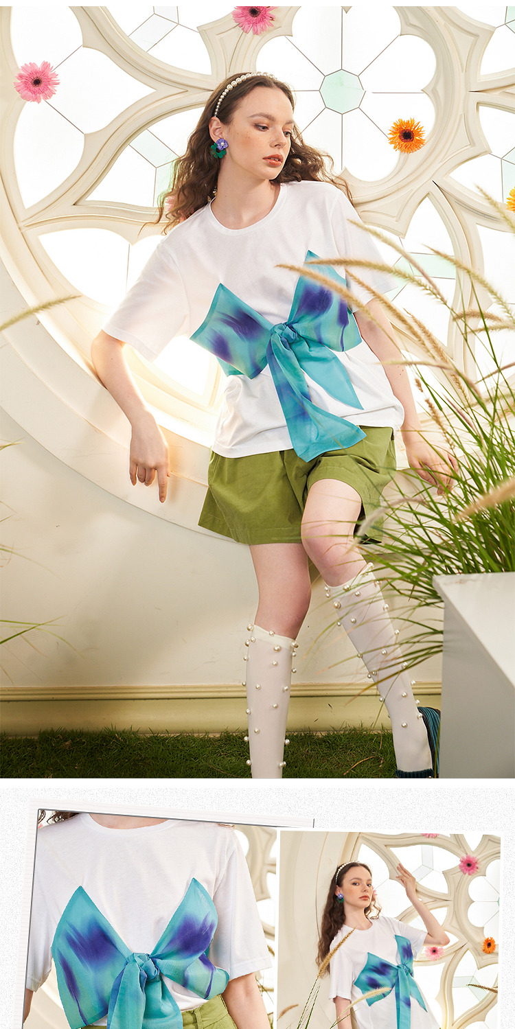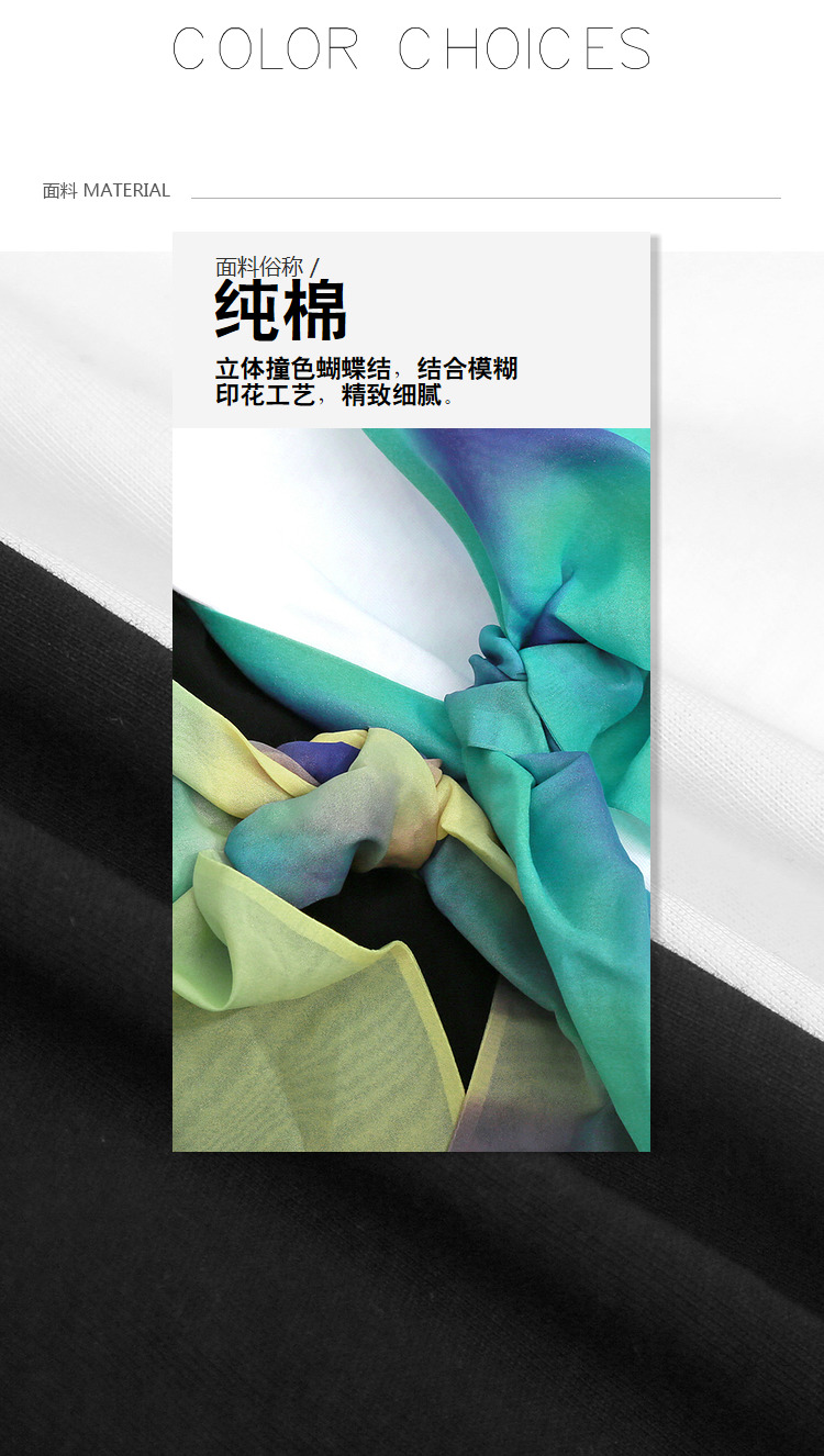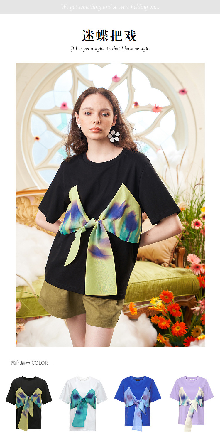 T恤 两三事迷蝶把戏 夏季新款时尚印花蝴蝶结拼接纯棉短袖t恤女
