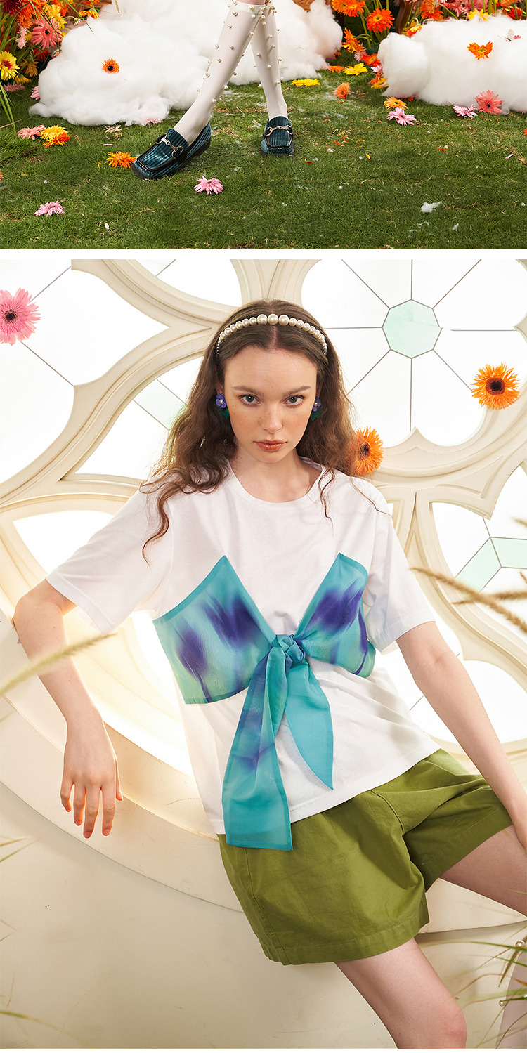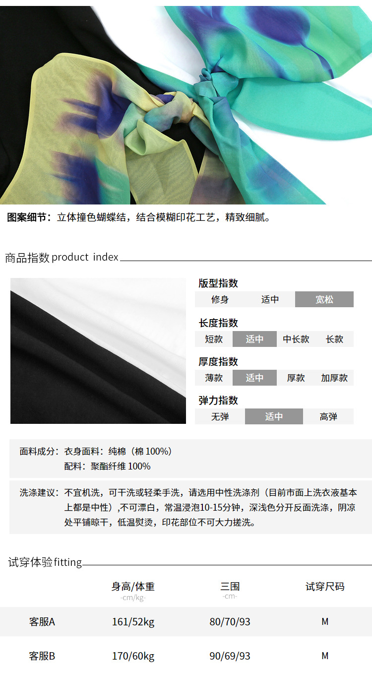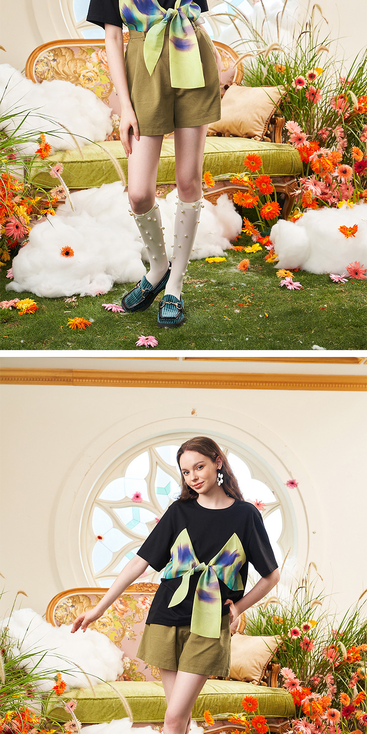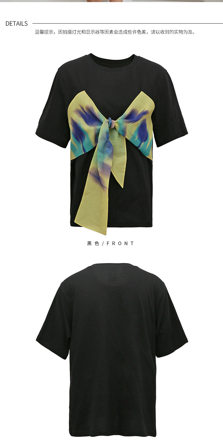 T恤 两三事迷蝶把戏 夏季新款时尚印花蝴蝶结拼接纯棉短袖t恤女