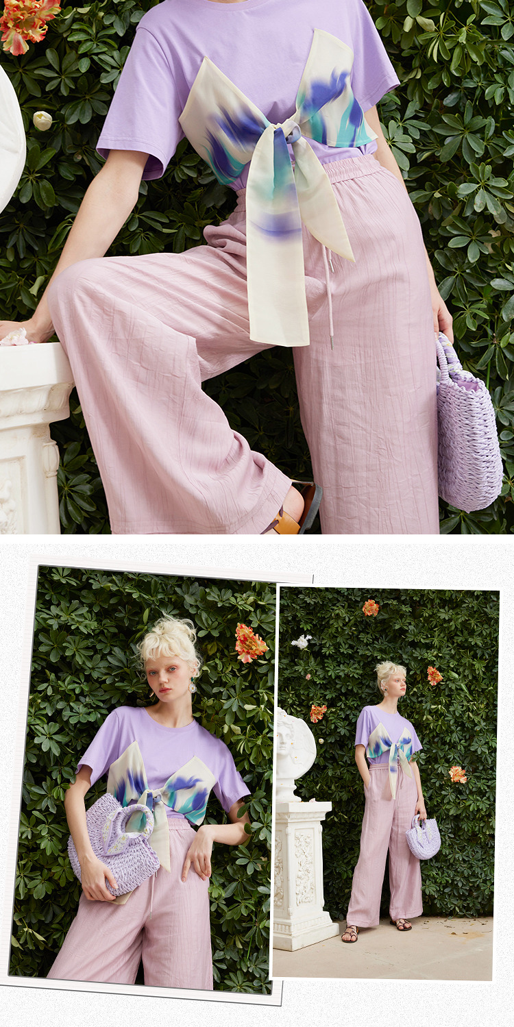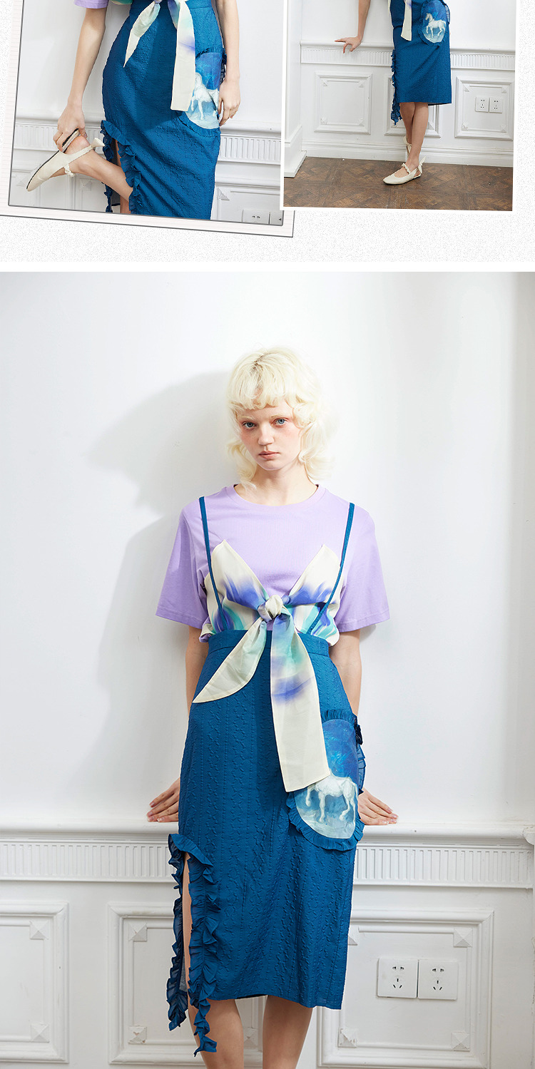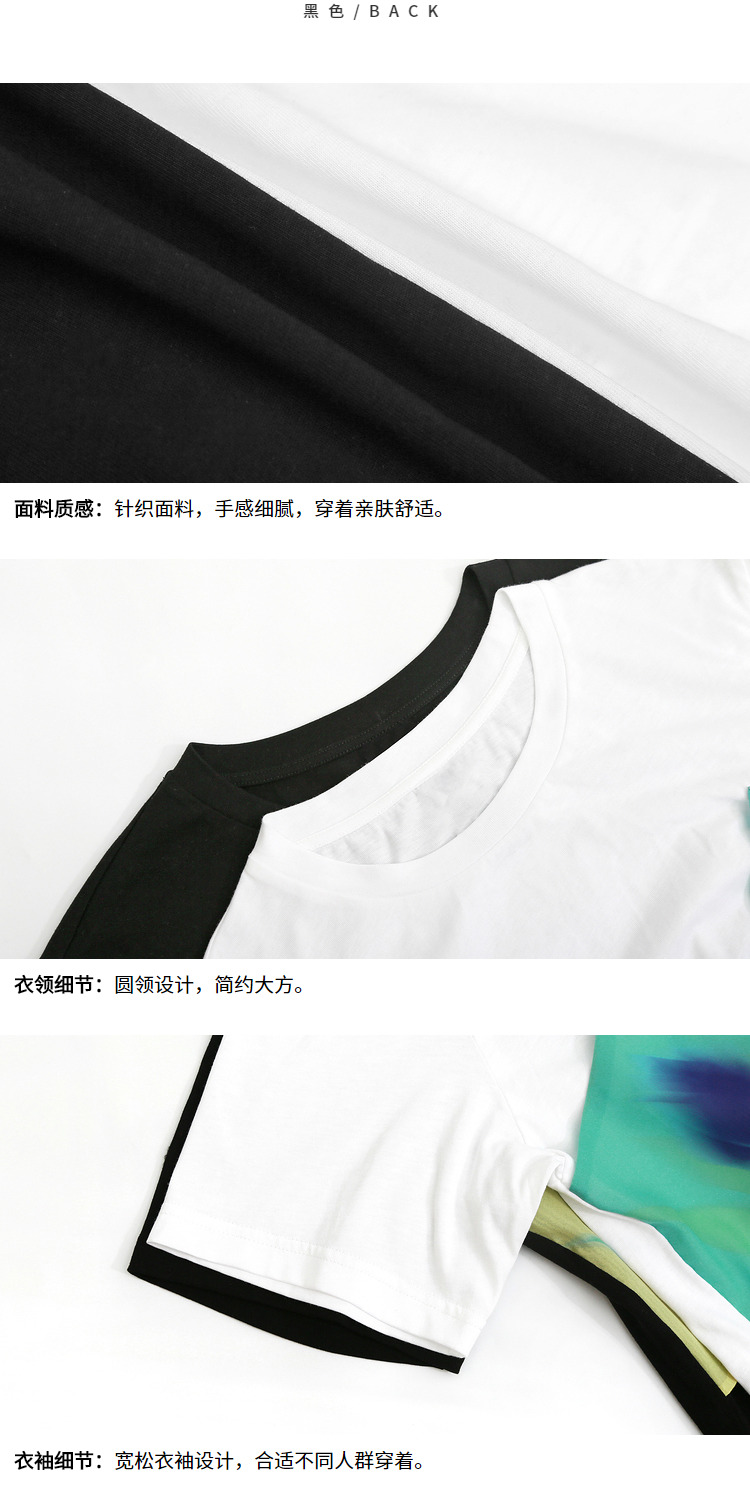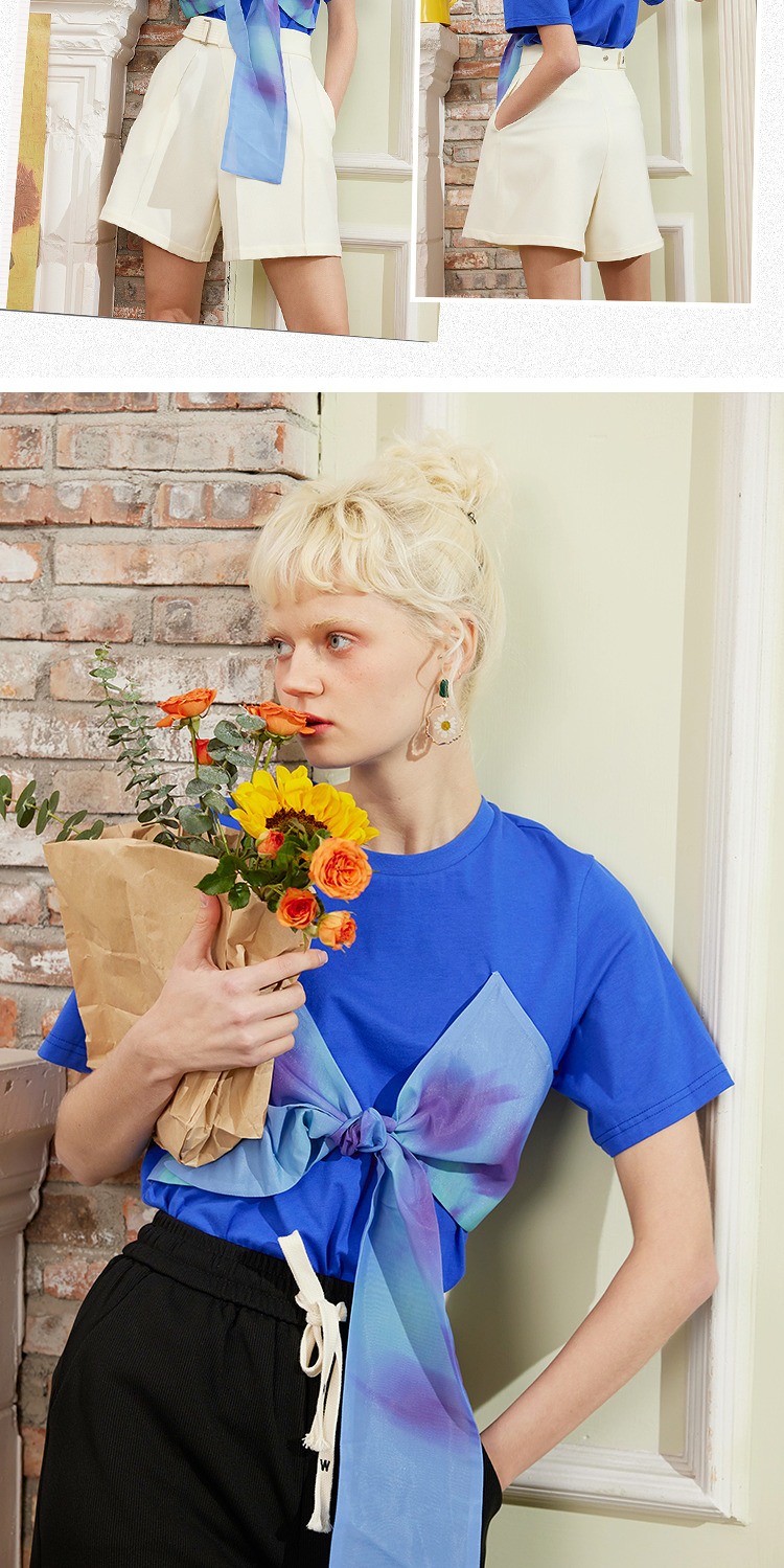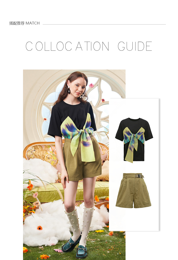 T恤 两三事迷蝶把戏 夏季新款时尚印花蝴蝶结拼接纯棉短袖t恤女