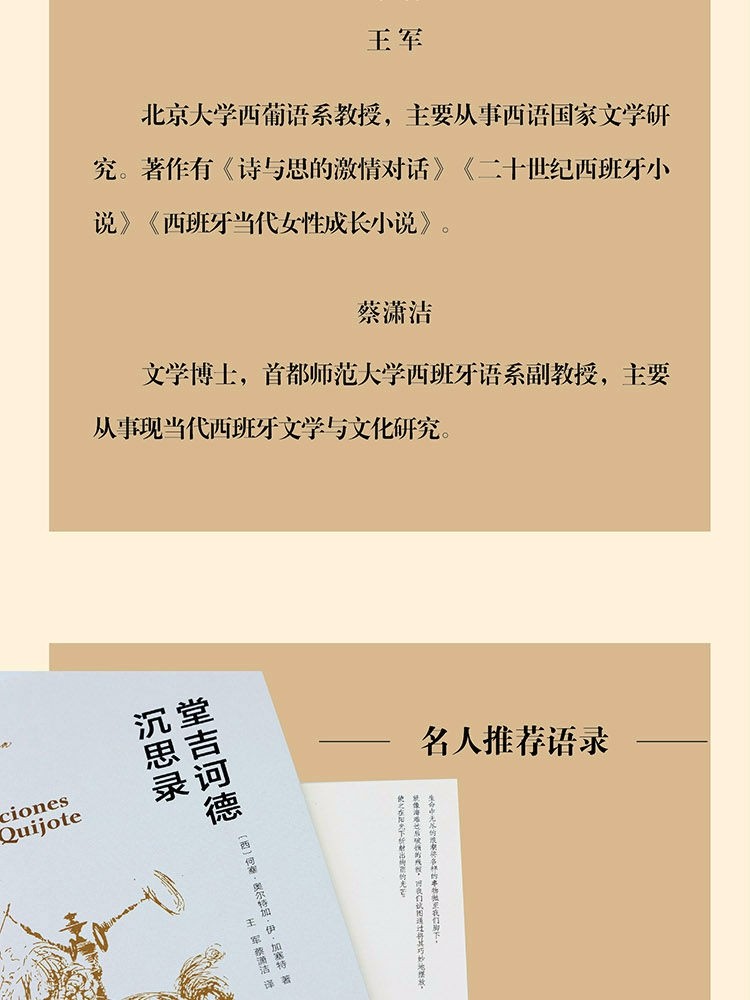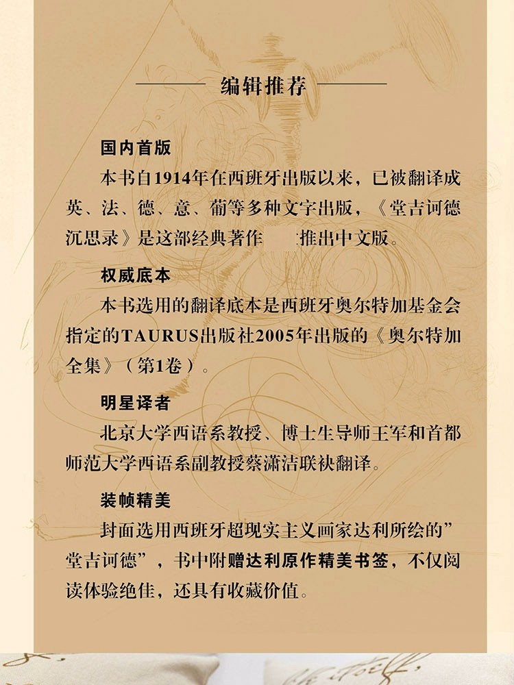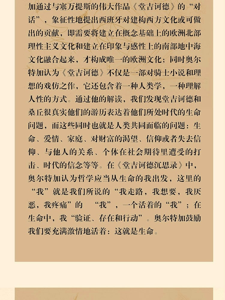 奥氏哲学是试图回应20世纪重大哲学问题的有深度的哲学之一,而《堂吉诃德沉思录》则是他哲学思想的奠基之作。——西班牙康普大学教授、奥尔特加研究专家哈维尔·萨莫拉