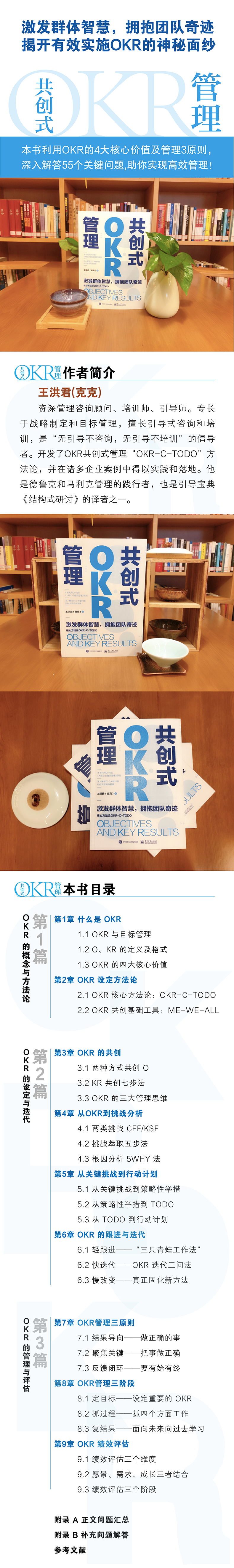 本书力图将OKR由概念和认知层面拉向具体的实践与操作层面,解决OKR推广中缺少工具、计划难以落地、无法赋能团队、无法激发成员潜能等问题。本书重点内容包括:对OKR概念的界定;OKR的“是”与“不是”;OKR核心方法论——OKR-C-TODO;OKR共创方法论——ME-WE-ALL;OKR制定和管理的全程引导技术的结合;OKR跟进“三只青蛙法”;OKR迭代三问法。本书可作为企业管理者和OKR推广的培训讲师用书,也可作为制定企业OKR的引导师或者咨询顾问参考用书。