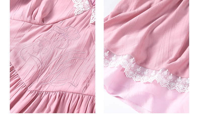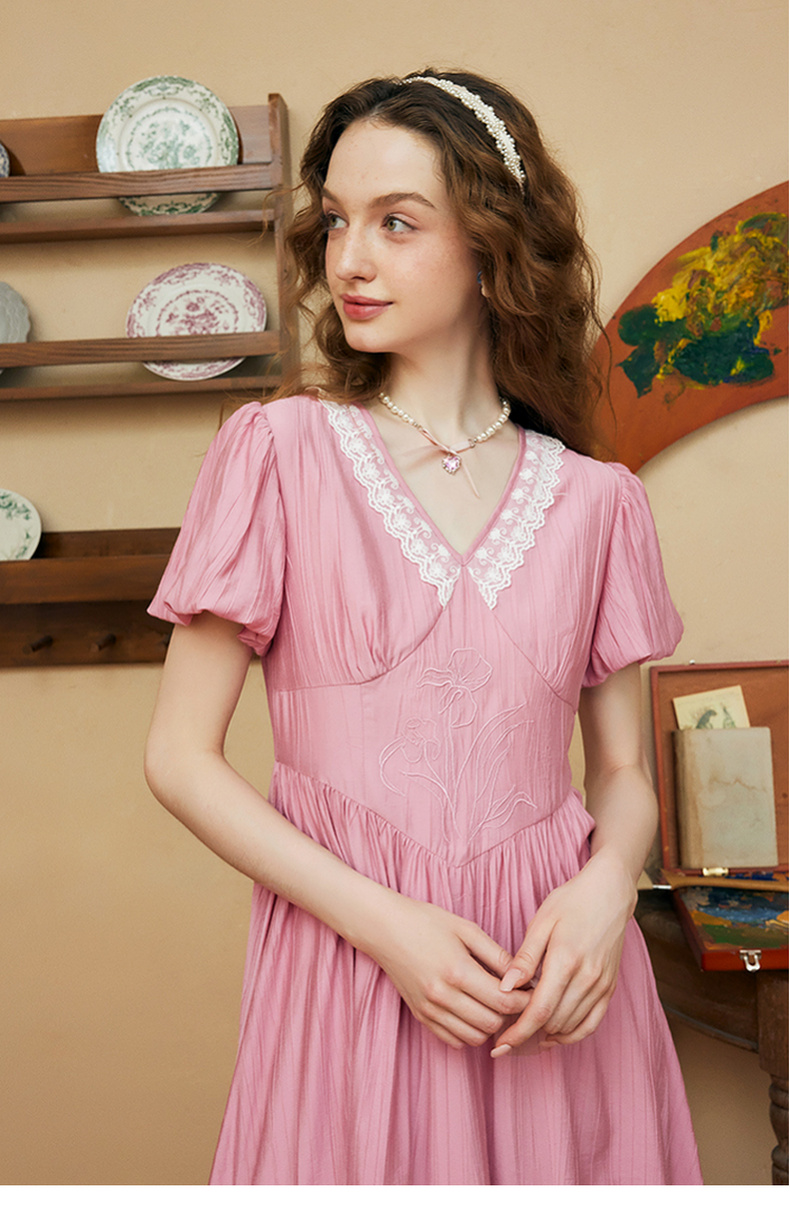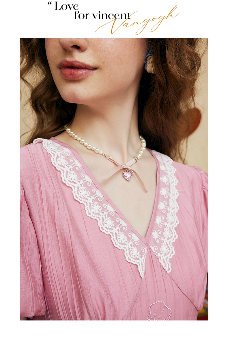 两三事梵高文艺悦夏鸢尾2024夏季新款蕾丝边拼接不规则绣花连衣裙