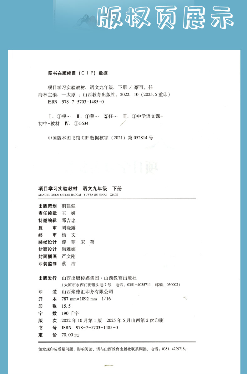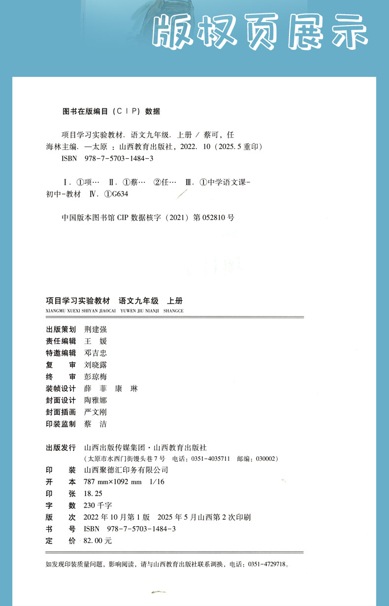 正版 二册项目学习实验教材 语文九年级 上下册 山西教育出版社出版 蔡可 任海林主编