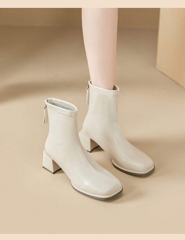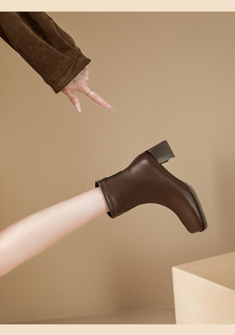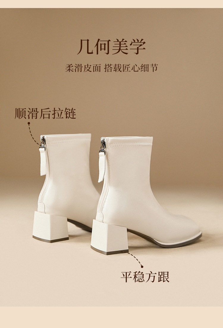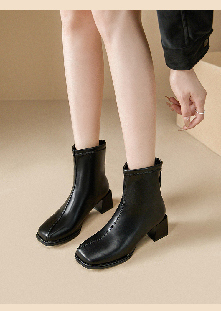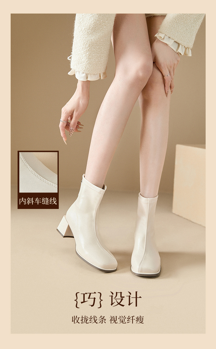 西遇法式方头短靴女新款秋冬高级感配裙高跟靴黑色粗跟瘦瘦靴D3547657