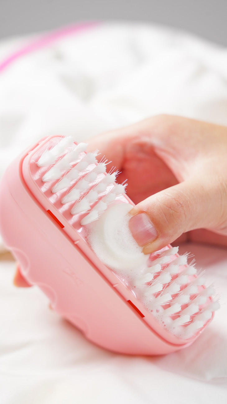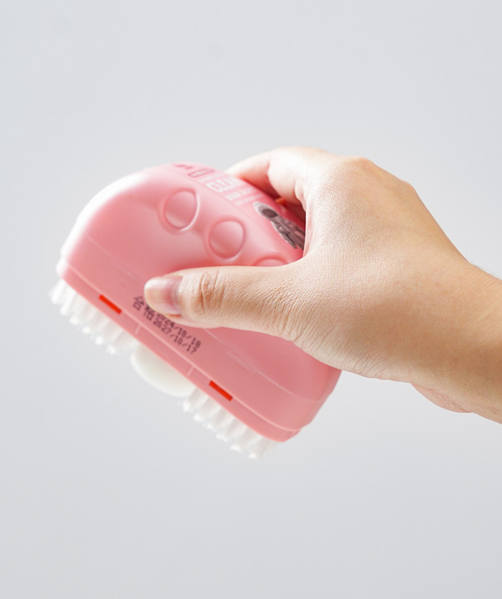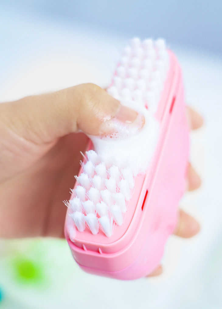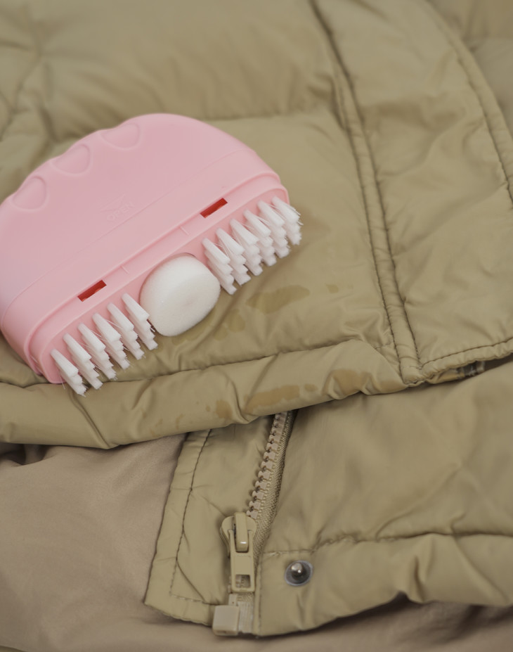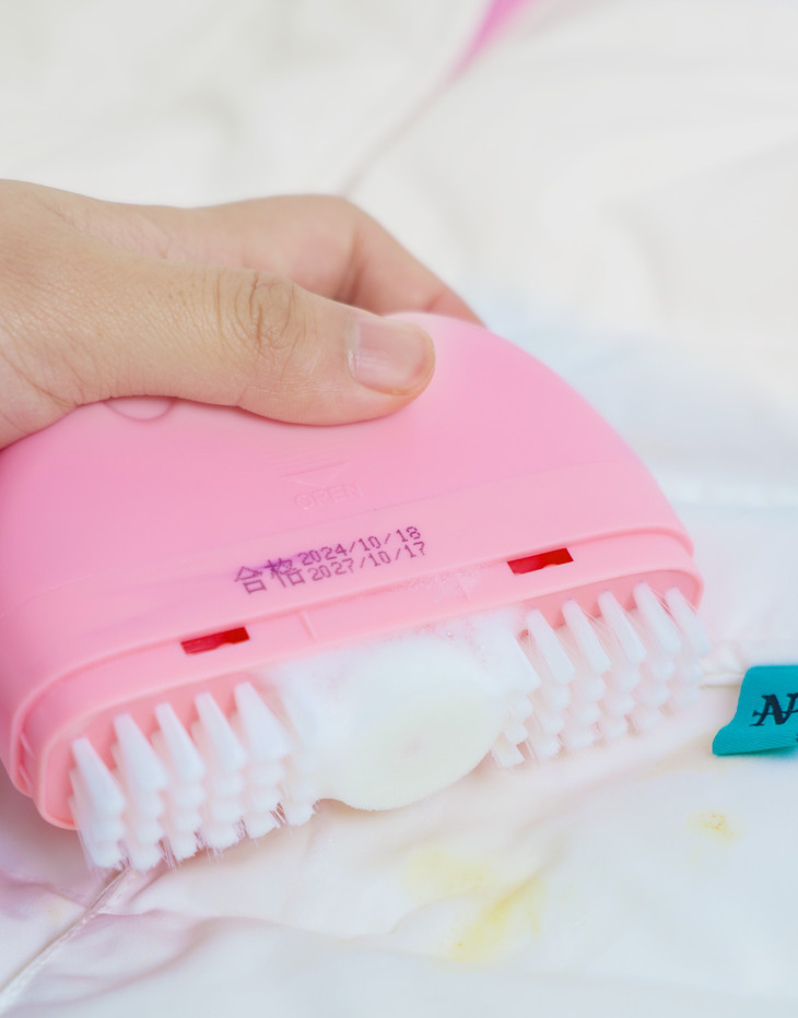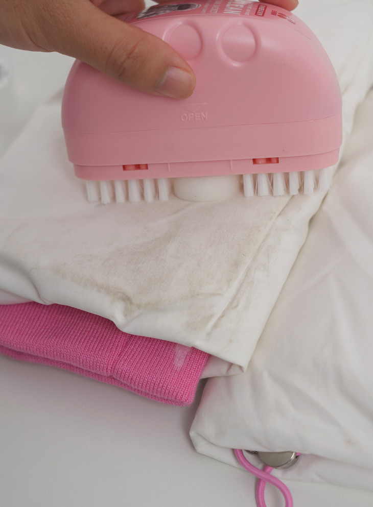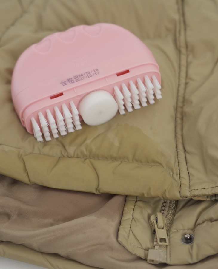 按压释放出清洁剂,用刷头反复洗刷至污渍消失