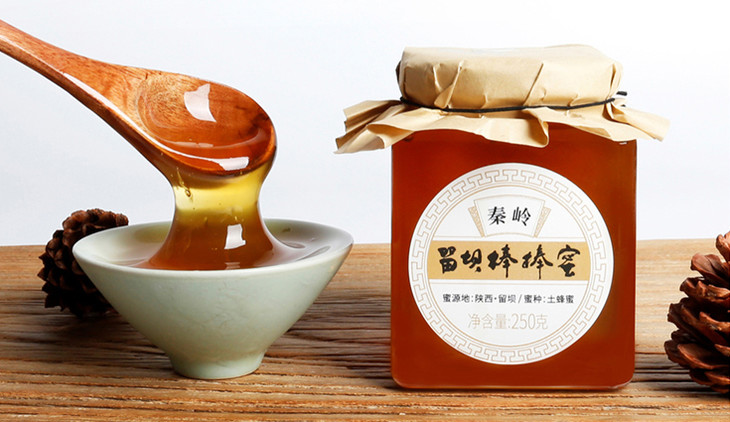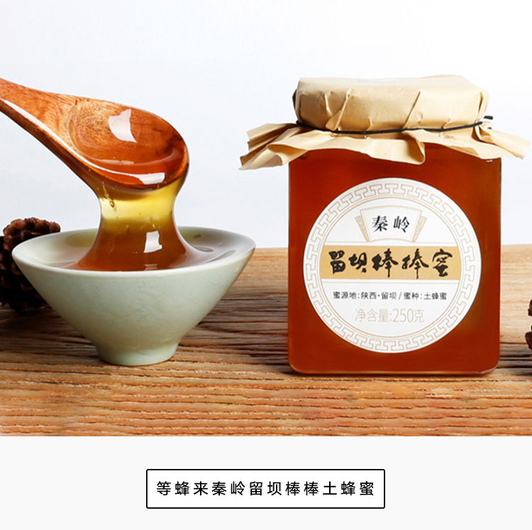 玻璃瓶盛装土蜂蜜,提升品质感,牛皮纸盒巧妙设计,不用工业胶水,纯手工折叠包装外盒。