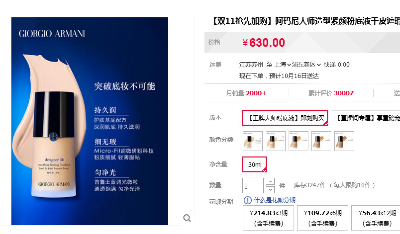 【大牌折扣】阿玛尼蓝标大师粉底液2# 30ML