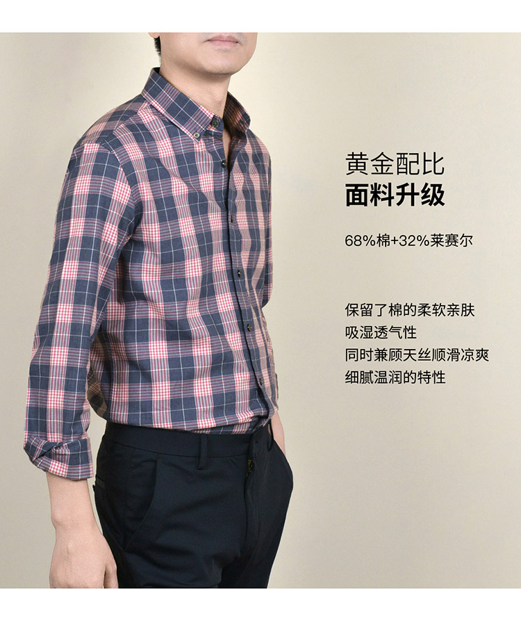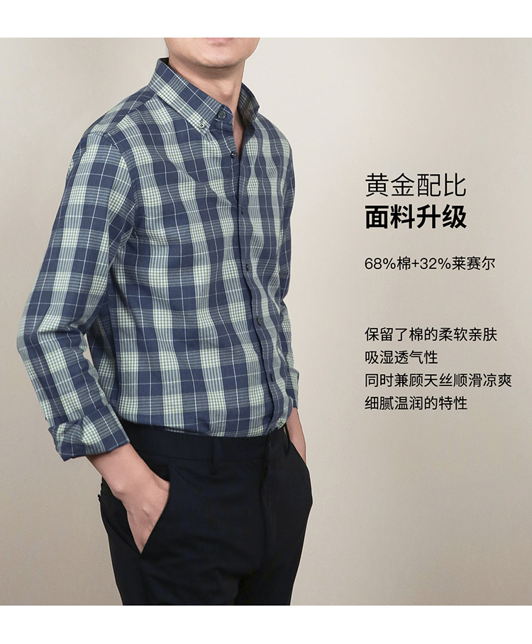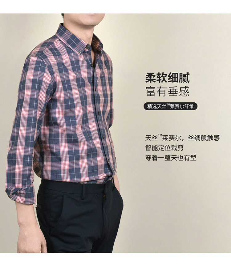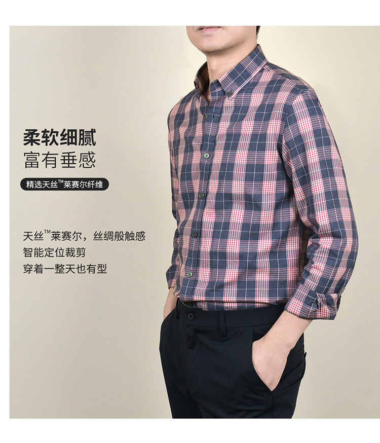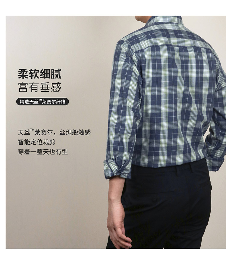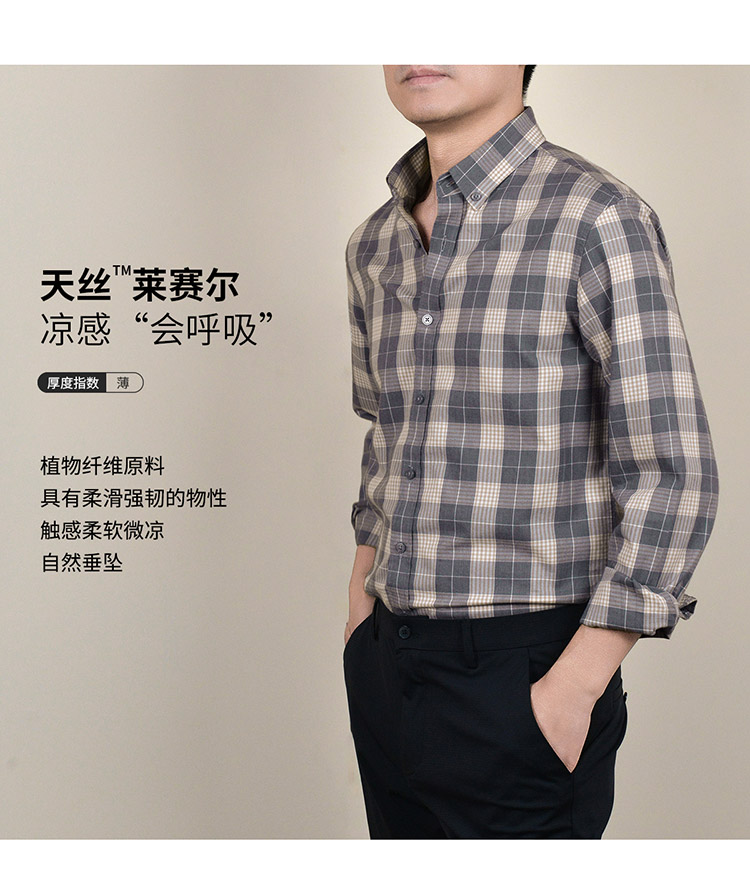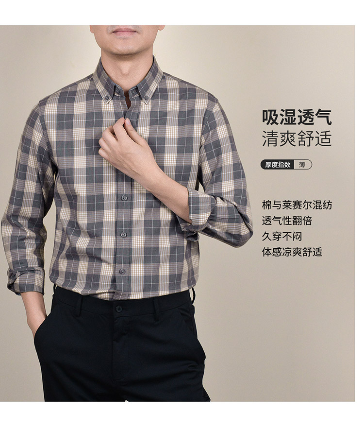 【莱赛尔棉】罗蒙春秋男士格子衬衫休闲通勤上班百搭长袖男舒适简约大方翻领男衬衣