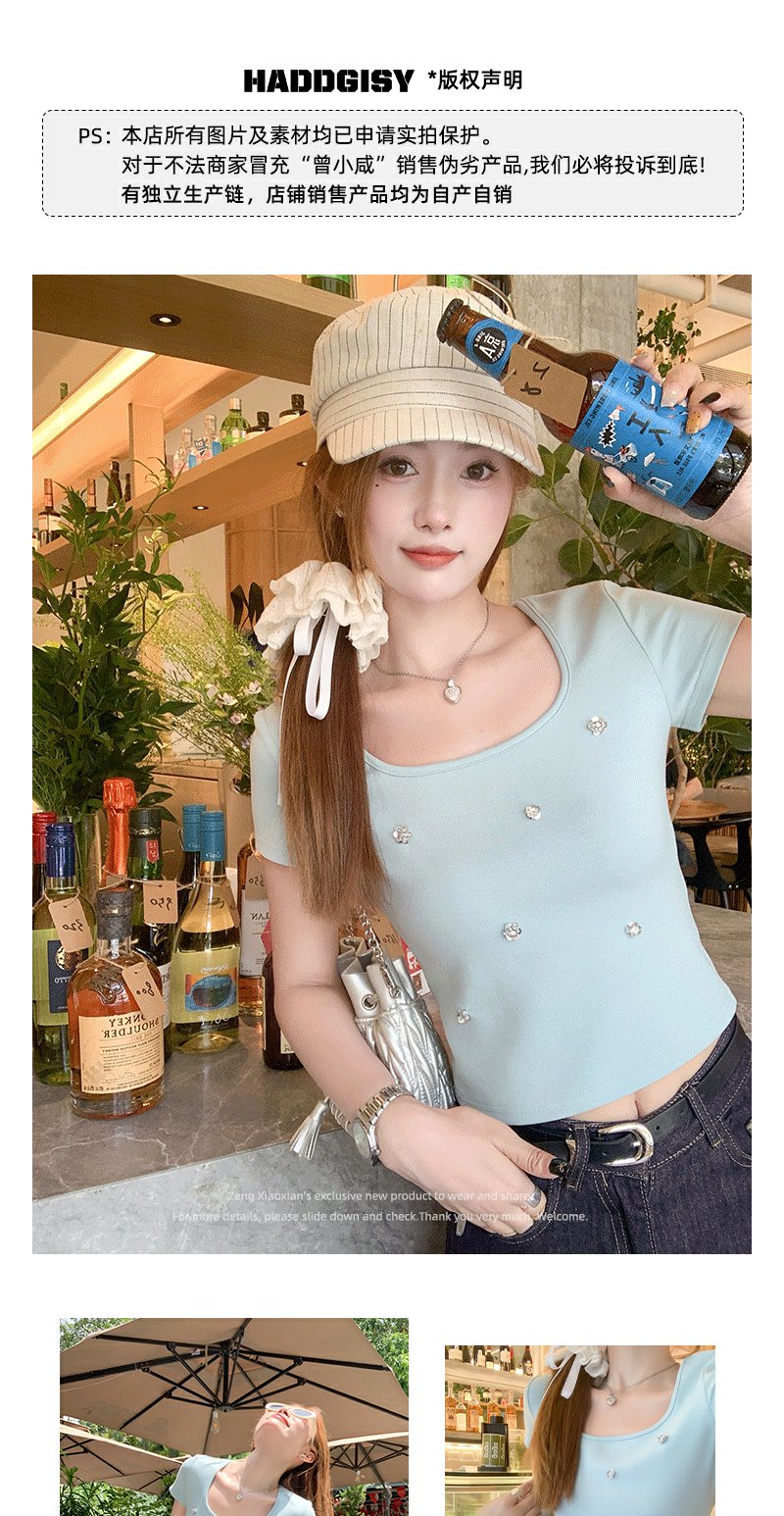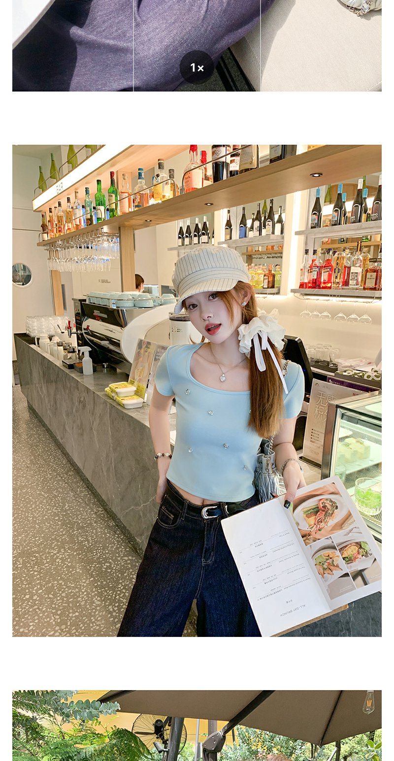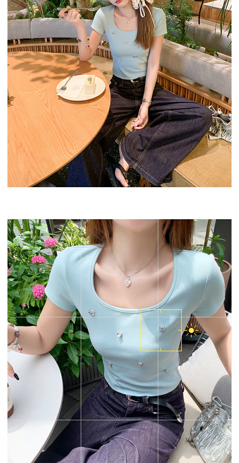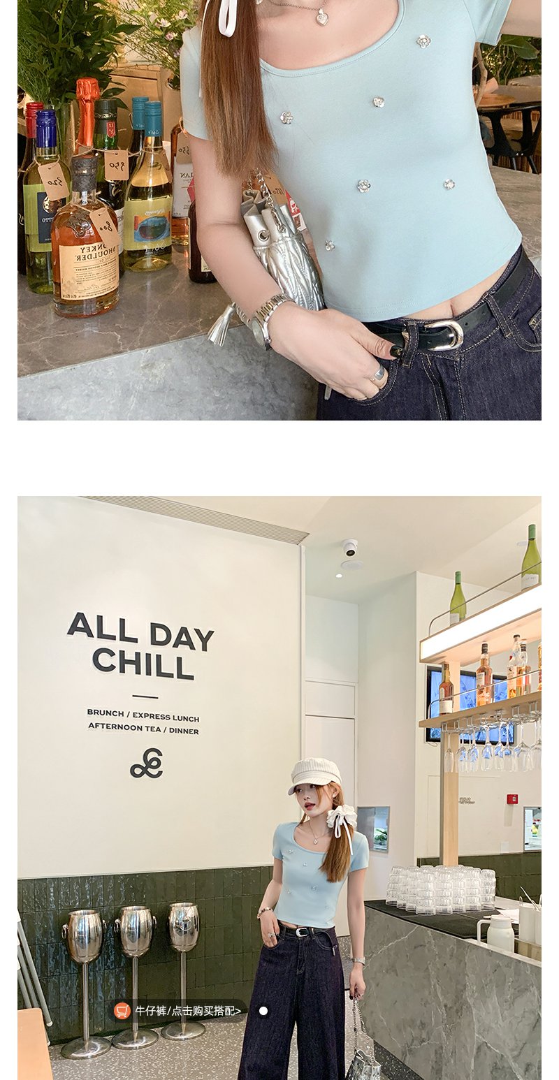 【99元任选2件】微信打折价!薄荷绿方领修身短款T