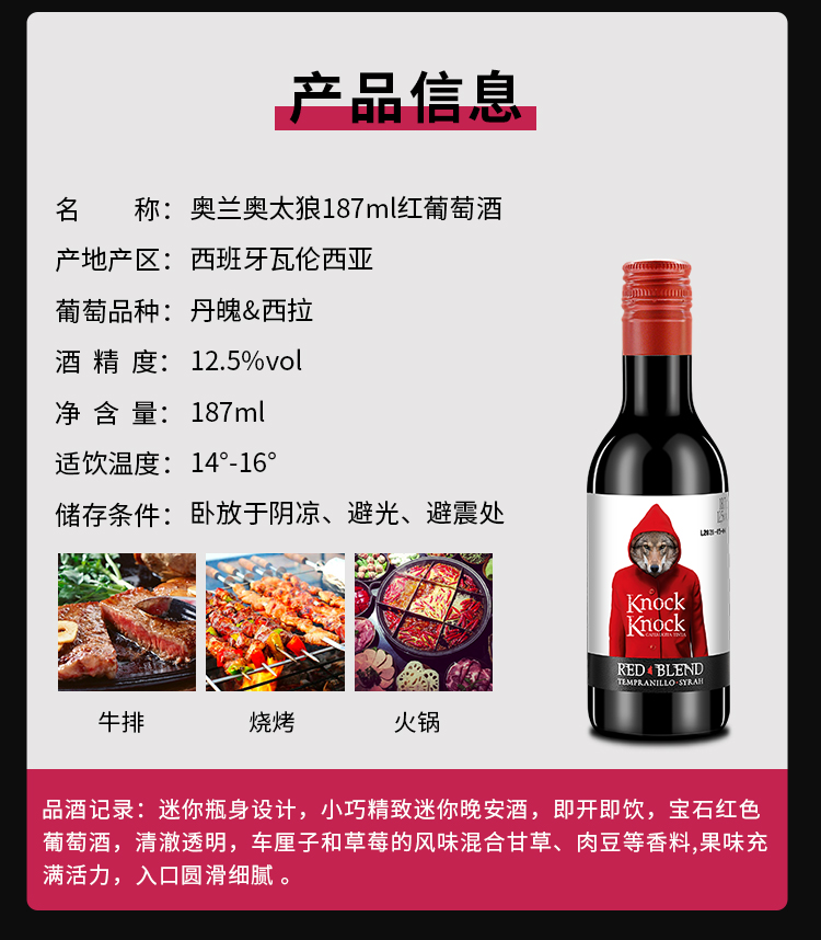 【官方正品】奥兰奥太狼187ml红葡萄酒*6瓶 西班牙原瓶进口