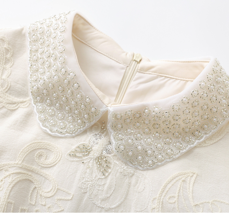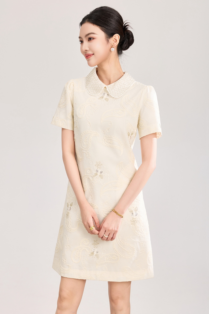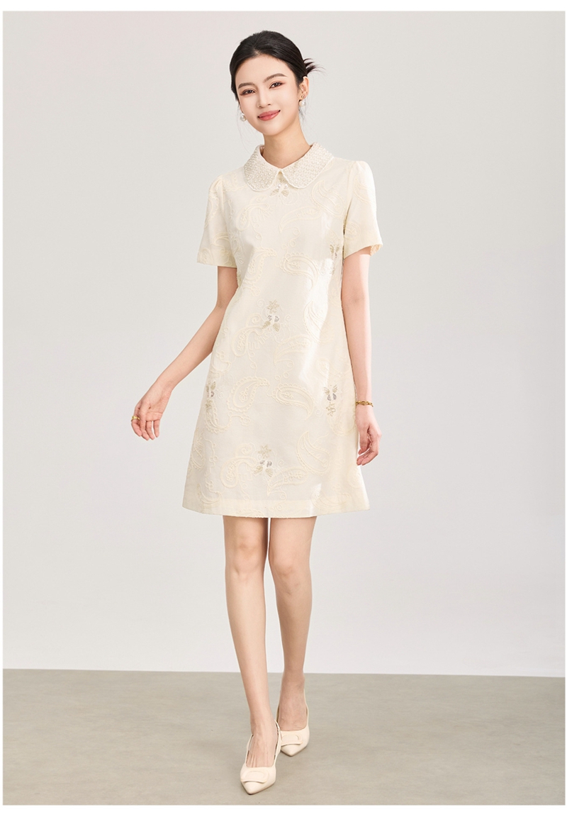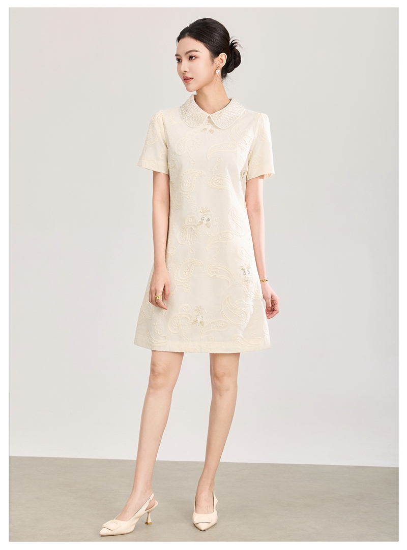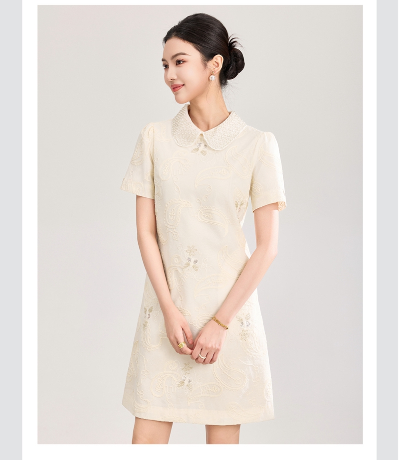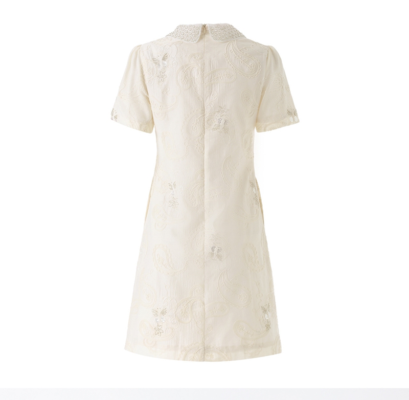 重工钉珠棉线刺绣娃娃领短袖收腰连衣裙