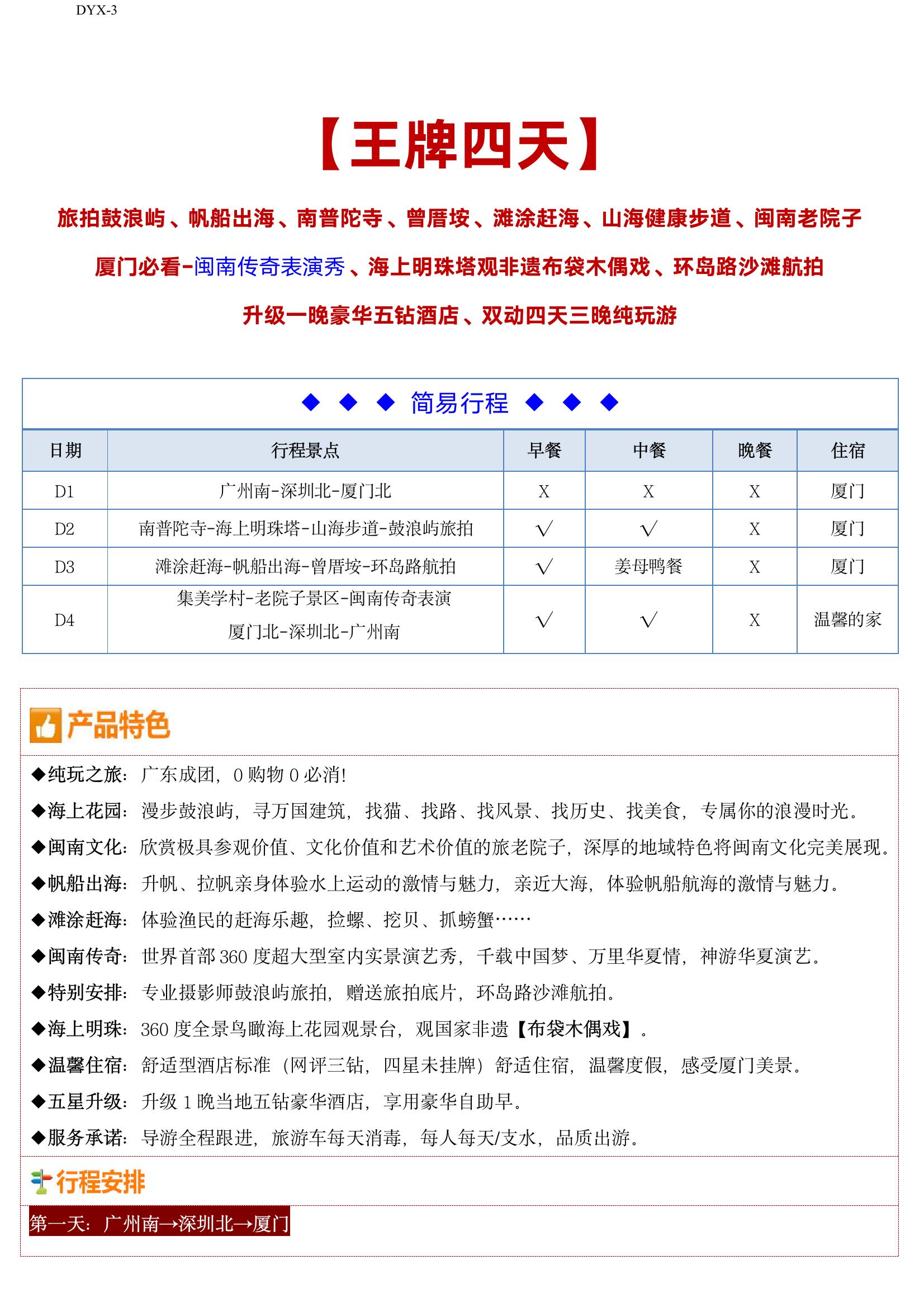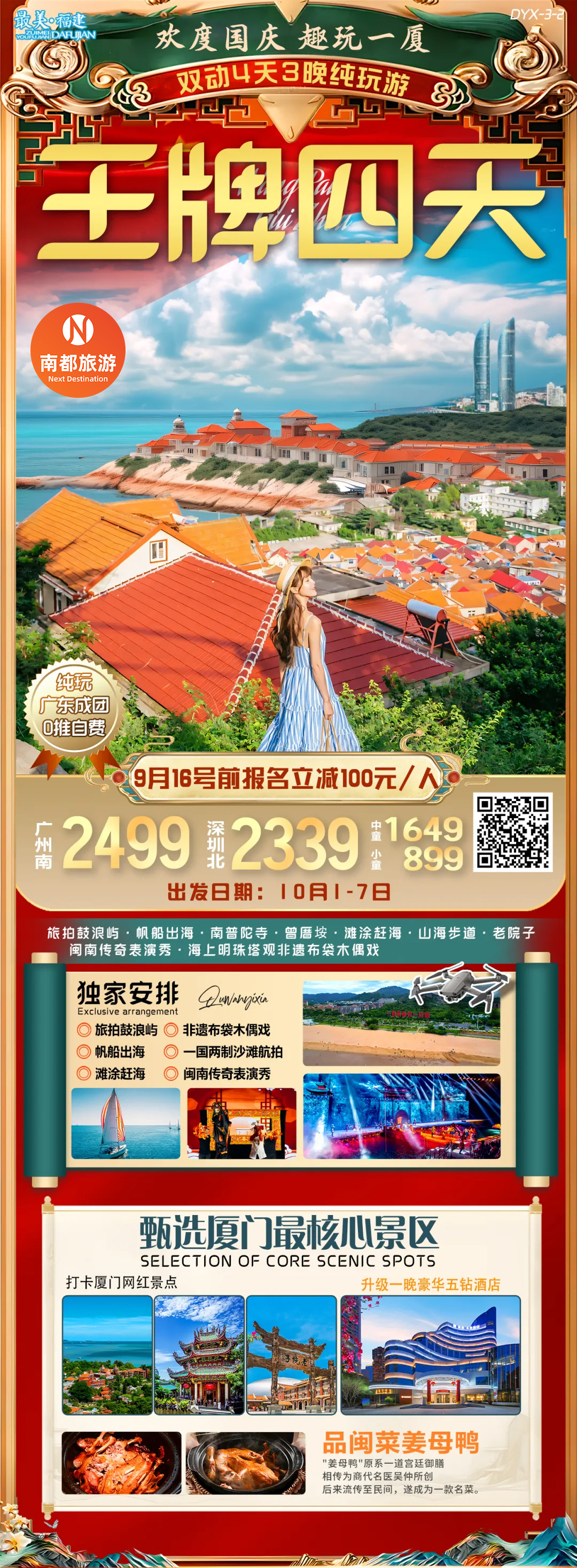 王牌厦门4天3晚,旅拍鼓浪屿·帆船出海·南普陀寺·曾厝垵·滩涂赶海·山海步道·老院子闽南传奇表演秀·海上明珠塔观非遗布袋木偶戏·航拍沙滩