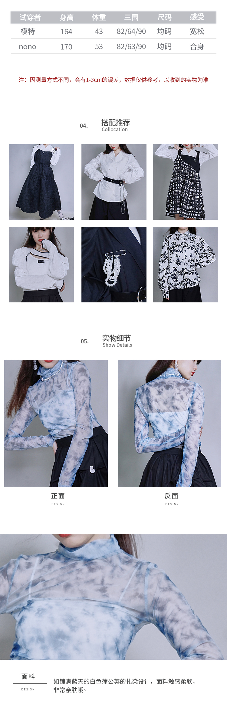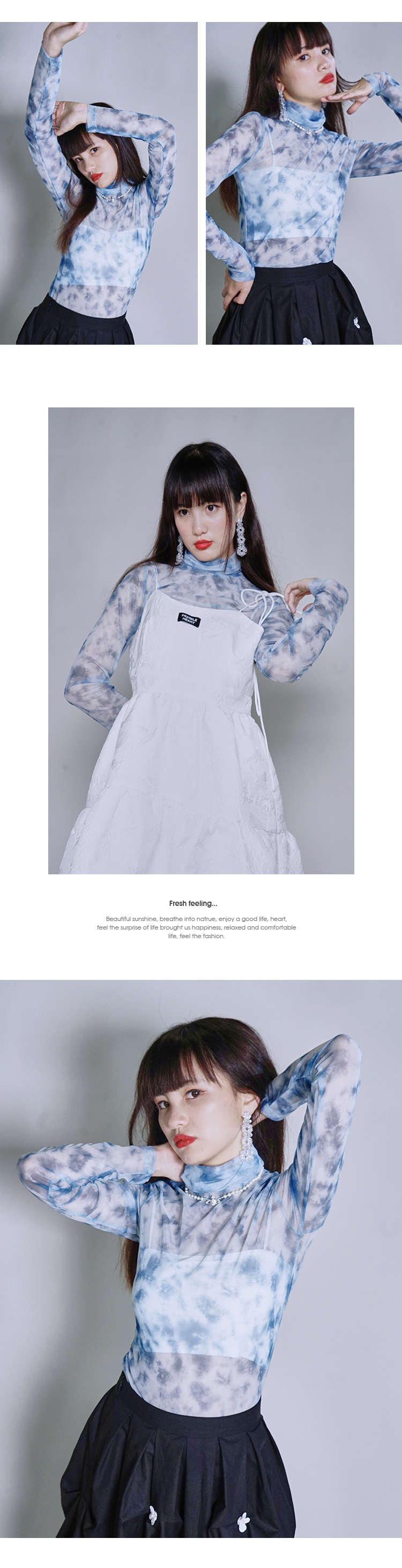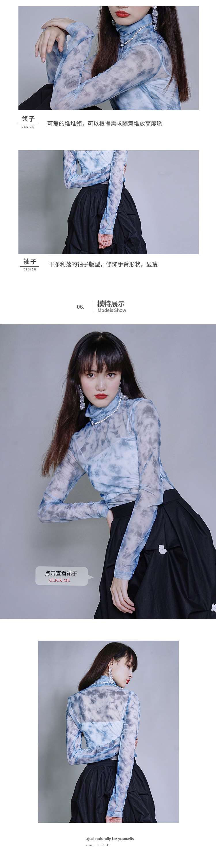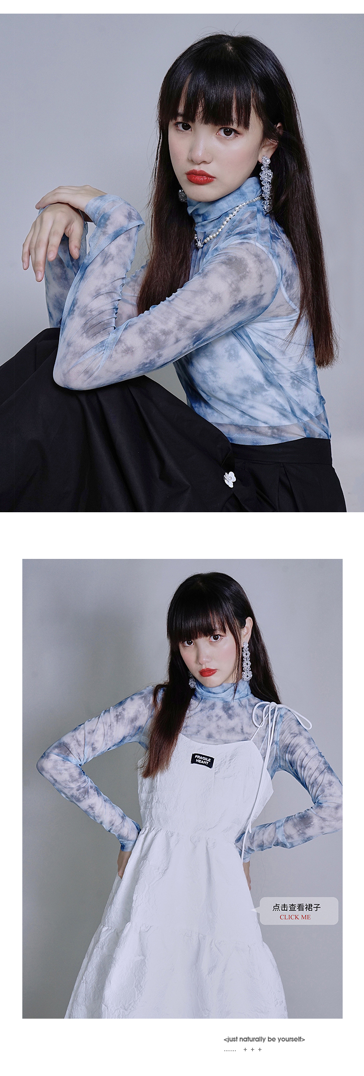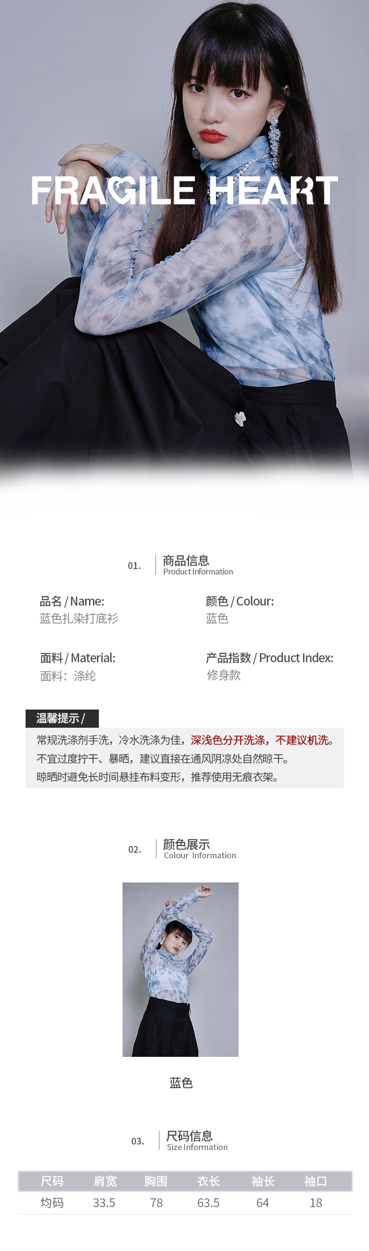 fragileheart蓝色扎染打底衫女春堆堆高领修身显瘦上衣蕾丝内搭新