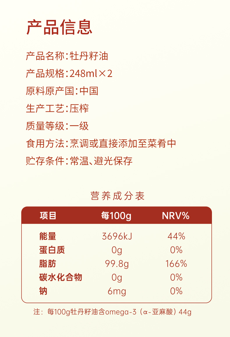 【积分兑换商品】牡丹籽油248ml/瓶*2瓶/盒